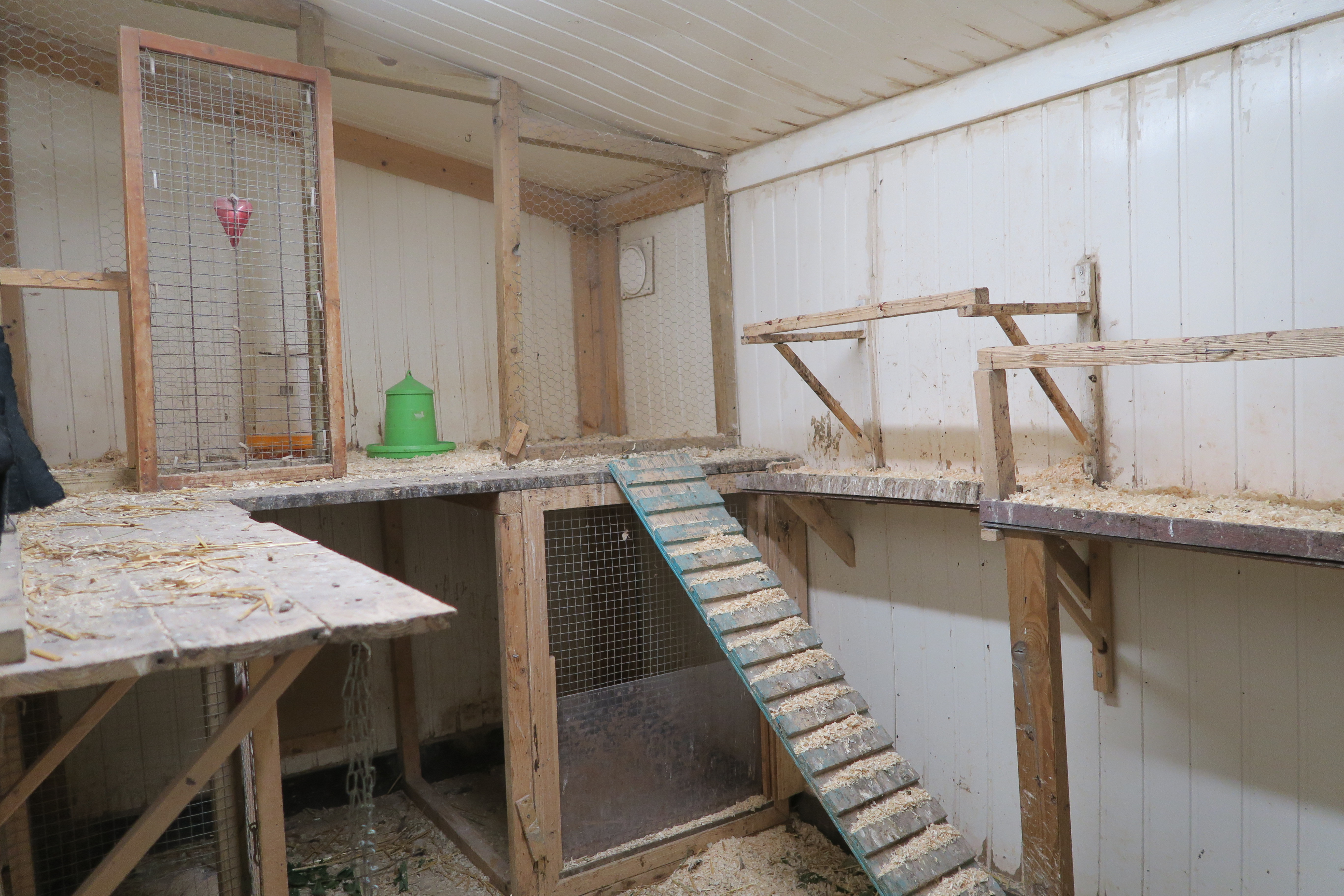 Det isolerte hønsehuset har kun kunstig lys og automatisk åpning på luken hønene bruker når de går inn og ut. Når lyset er slukket, galer heller ikke hanen.