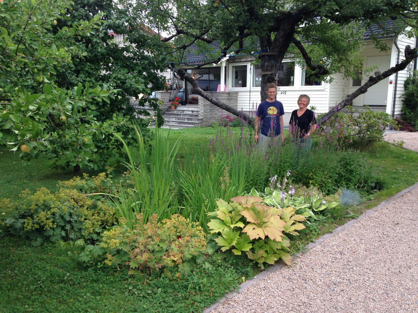 Leder du vannet fra takrennene ned i regnbed vil du unngå at vannet samler seg opp inntil huset.
