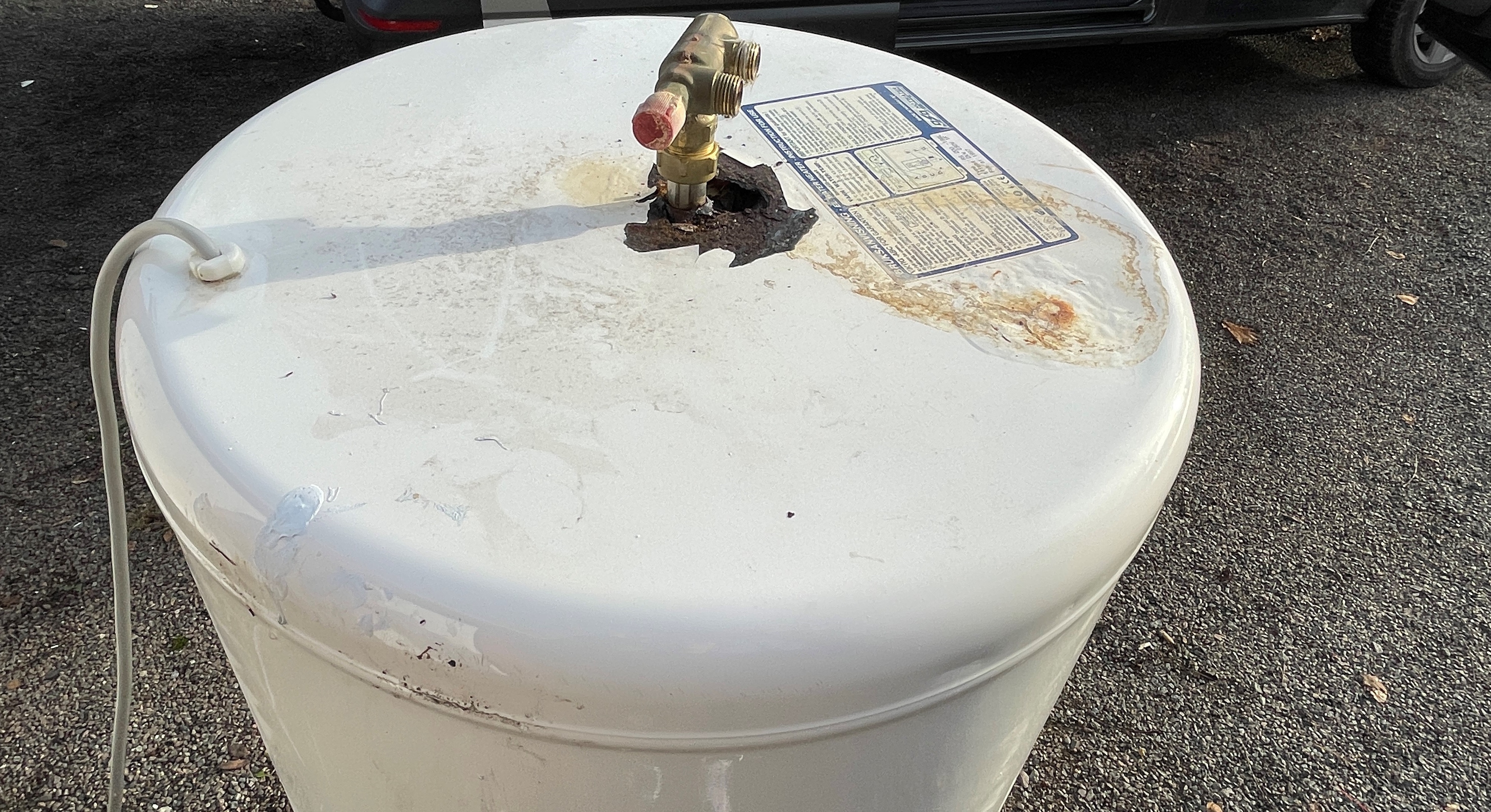 Da rørleggerne kom for å fjerne den gamle tanken, falt emalje av, og de konstaterte at det var så store rustskader rundt ventilen på toppen av tanken, at det rett og slett hadde blitt et hull.