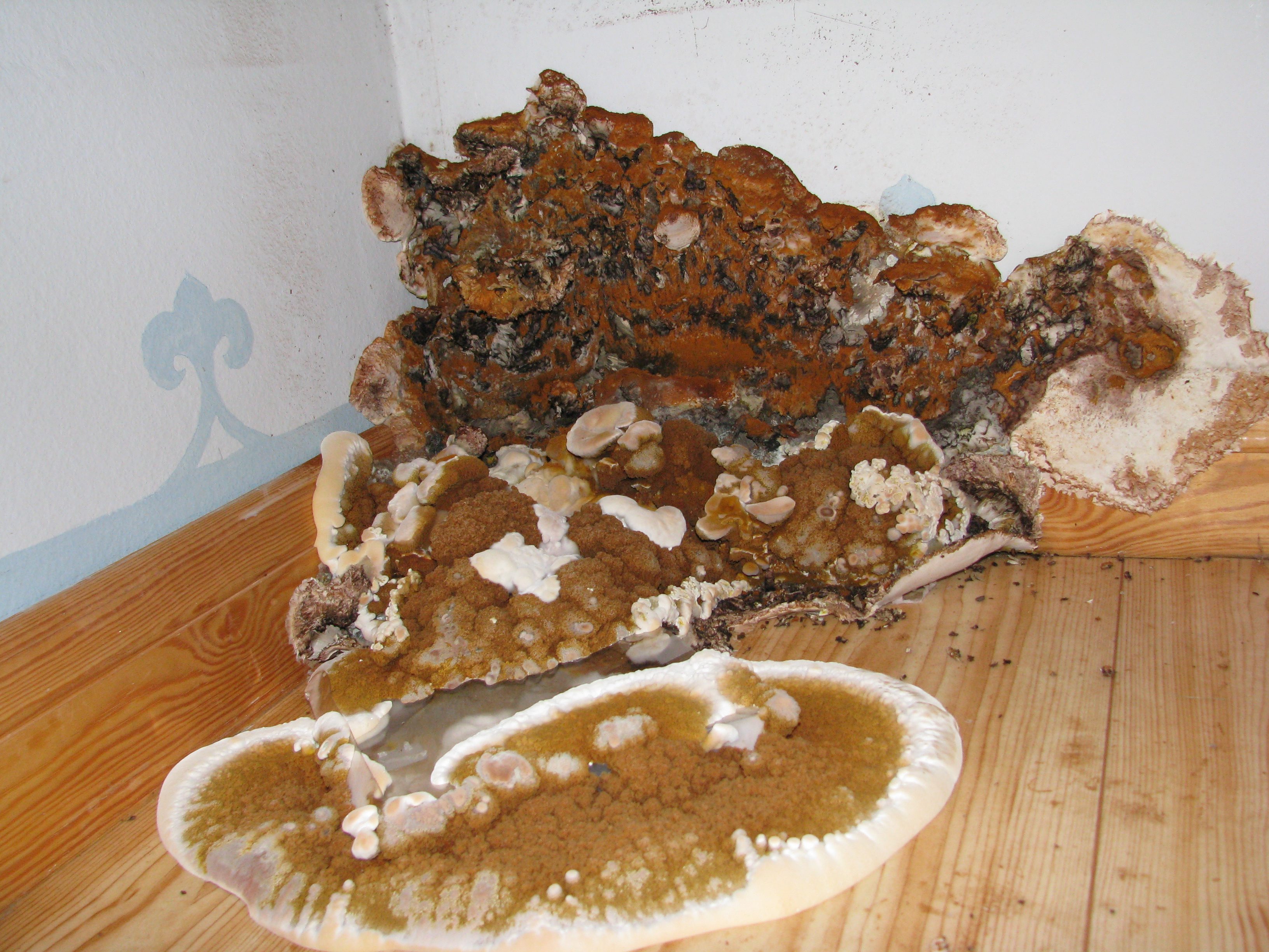 Et fruktlegeme av ekte hussopp har dukket opp på gulvet. Foto: Mycoteam