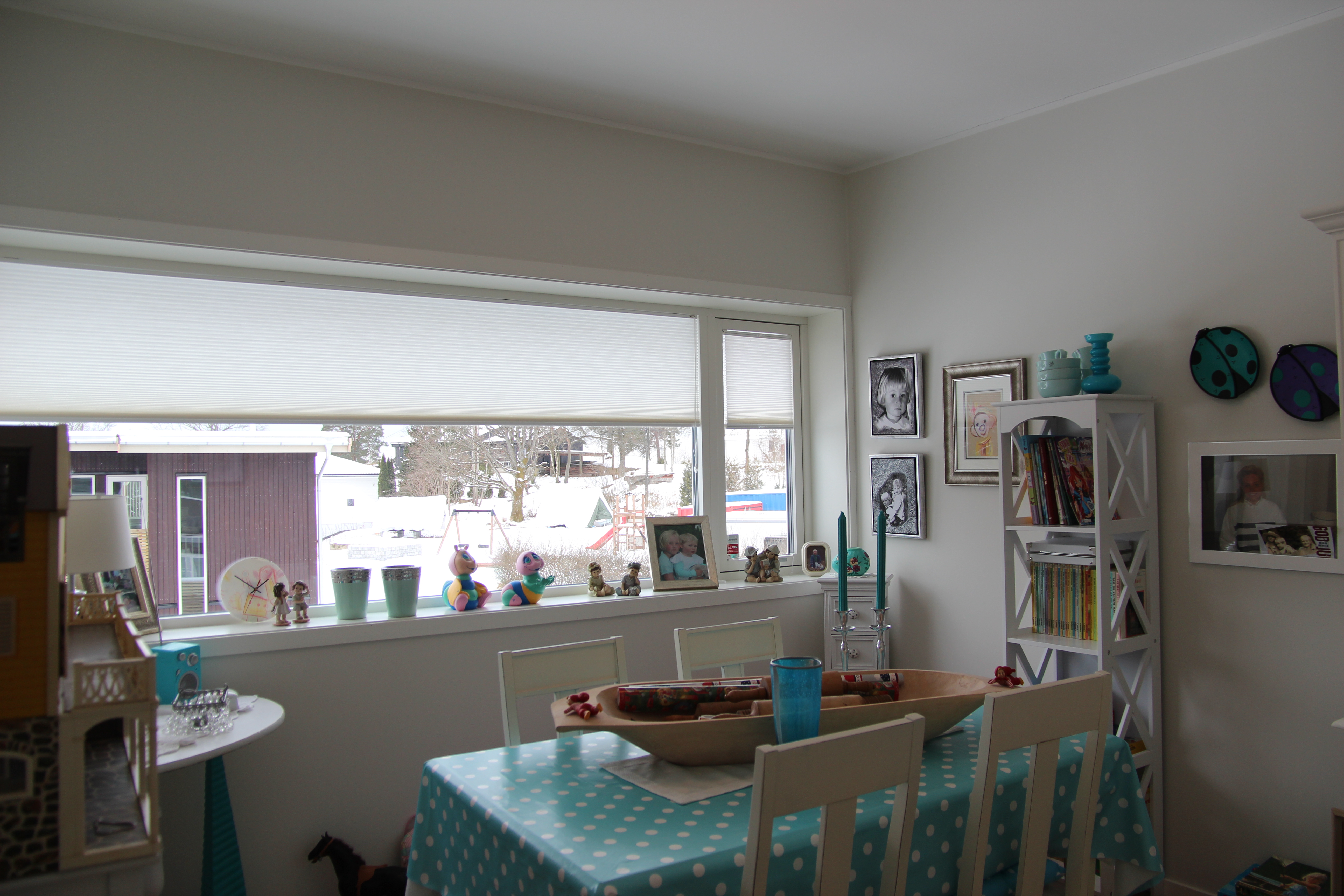 PLISSE: Hobbyrommet har fått delikate hvite plissegardiner, slik at Palm og barnebarna kan pusle uforstyrret. Foto: Linda Ørstavik Öberg.