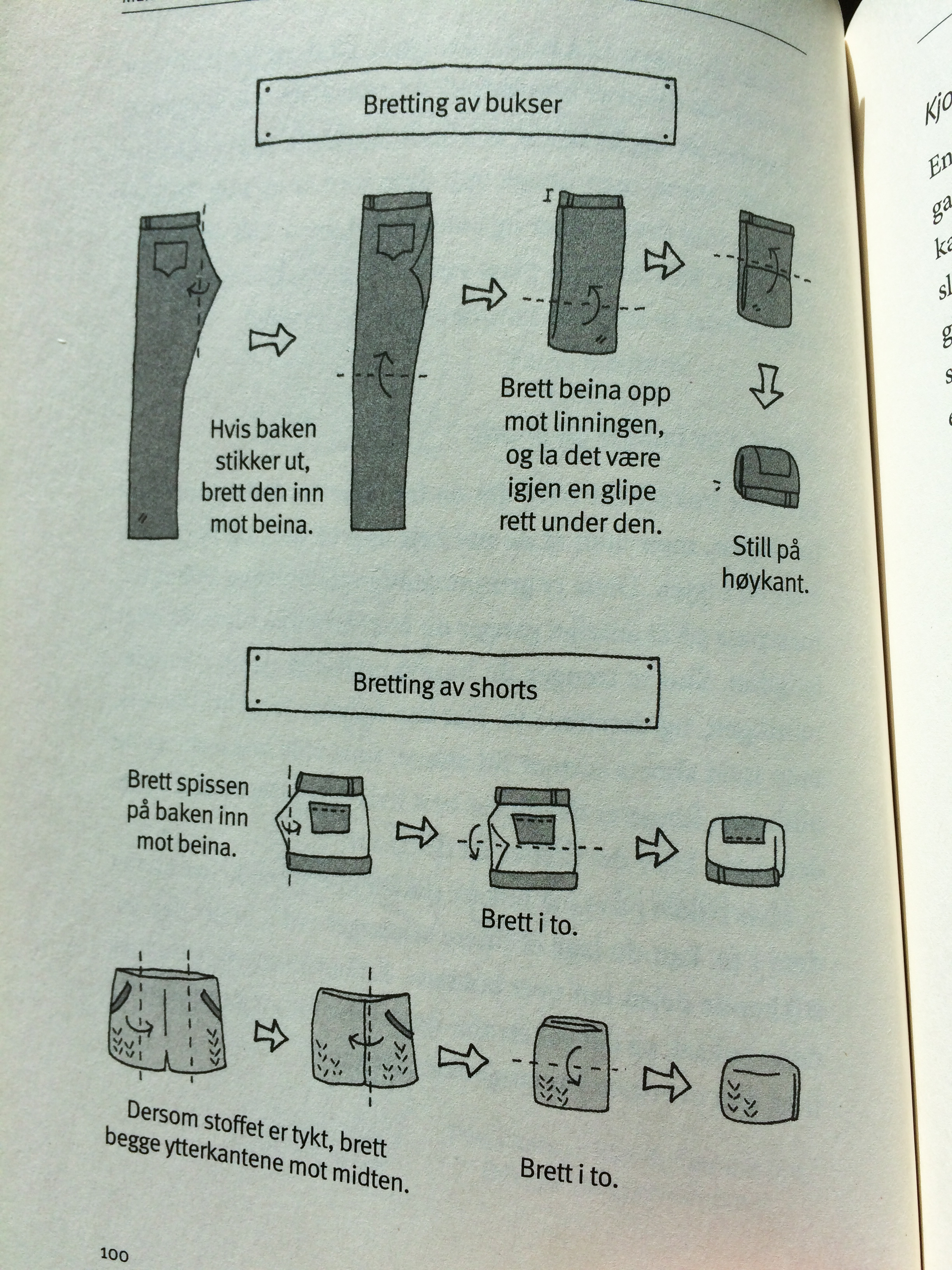 Slik skal bukser og shorts brettes i følge Marie Kondo - og det fungerer faktisk. Foto fra "Mer ryddemagi".
