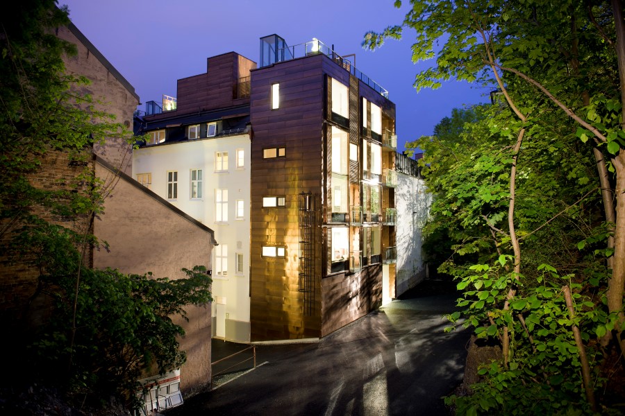 I Parkveien fant han en klassisk tomt. Mellom to gamle 1890-tallsgårder stod det et par biler og noen søppelspann. En 7 meter bred og 28 meter dyp stripe ble til slutt gjort om til ni leiligheter, fra en liten hybel på 18 m2 til en 136 m2 stor toppleilighet. Bygget binder nå kvartalet sammen på en kreativ måte. Spennende materialer er brukt. På fasaden er det kobberplater og felt av eik. Inne er det betongvegger, og eik er brukt både i dører og gulv. På toppen ligger en av byens flotteste takhager, en skikkelig hage anlagt av hagedesigner. Lysutfordringene ble løst med en lyssjakt midt i bygget. Den gir lys inn til leilighetene også fra innsiden. Kontrastene er store. Leilighetene som ligger inn mot den stille bakgården med utsikt mot en flott sveitservilla gir en følelse av landlig ro, mens de som ligger ut mot trikkeskinnene i Parkveien gir en mer urban byfølelse.