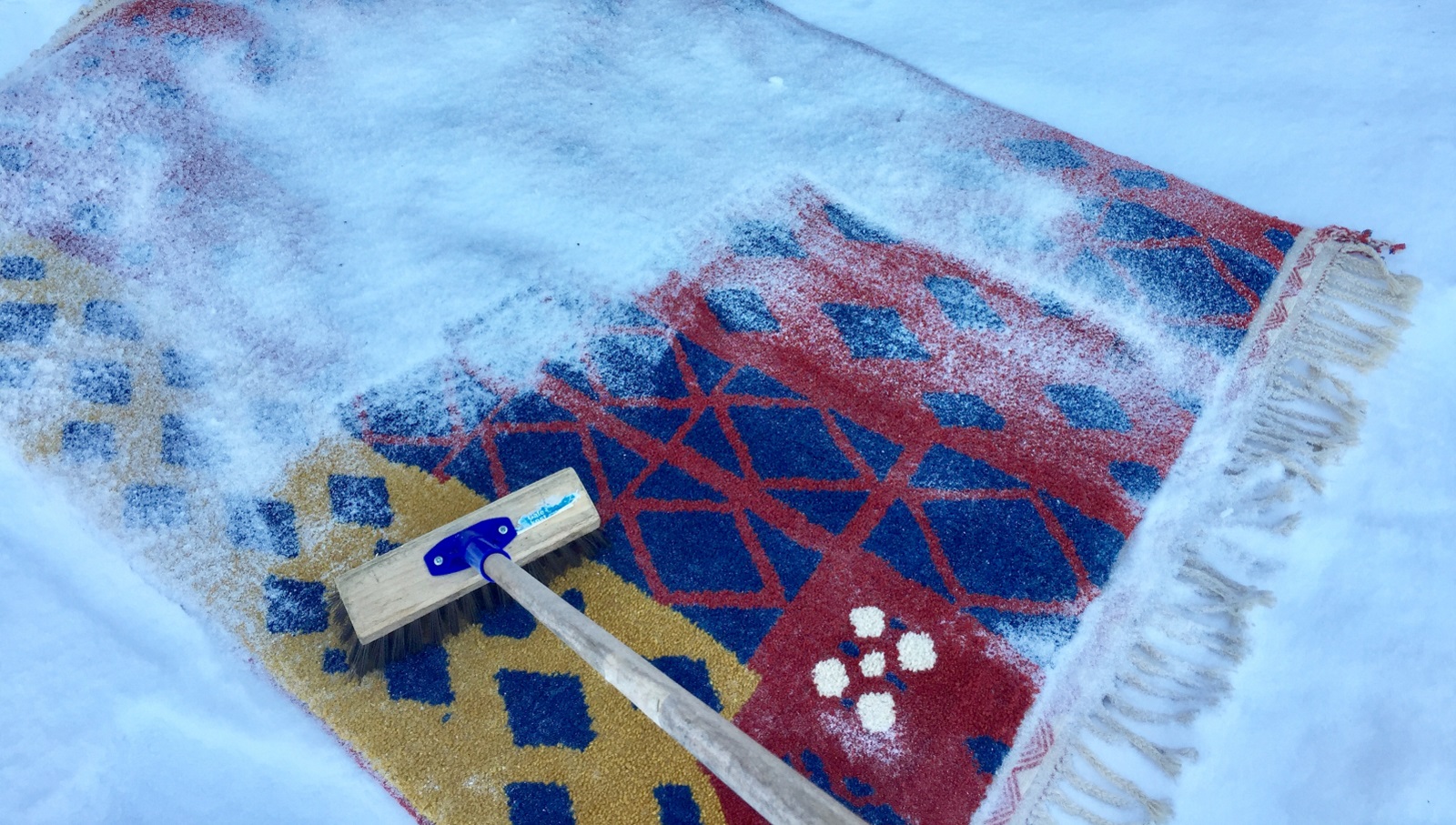 Du kan også legge teppet i snøen og koste ren, hvit snø over det – og så koste snøen bort igjen. Gjentar du dette et par, tre ganger får du bort det meste som har samlet seg på overflaten.