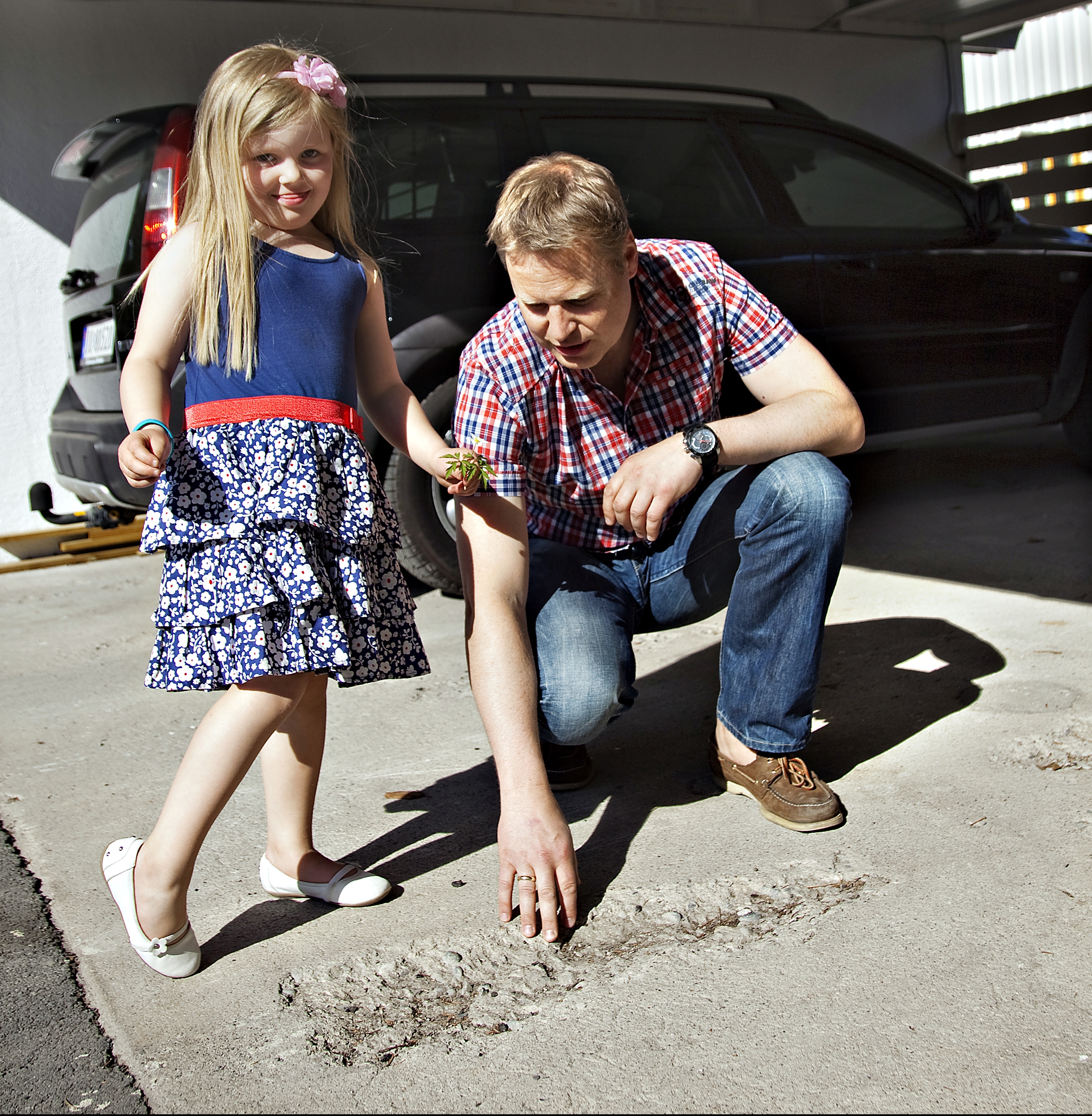 – Hvis det er gått så langt at det er groper i gulvet bør disse jevnes ut med en sementpolymerblanding. Har du veldig store krater med hjulspor er sannsynligheten stor for at saltet har gjort så mye skade at du må pigge opp og støpe på ny, men ved mindre ujevnheter vil sementpolymerblandingen vår fungere godt. Den består som navnet tilsier av sement og et bindemiddel som gjør massen sterk og fleksibel. Dersom du ikke har hull å tette, hopper du selvsagt over denne delen. Så grunner du gulvet med vår vannbaserte epoksy, som fester svært godt til både betong og andre overflater. Deretter venter du til det er gått mer enn 24 timer, men mindre enn 48.