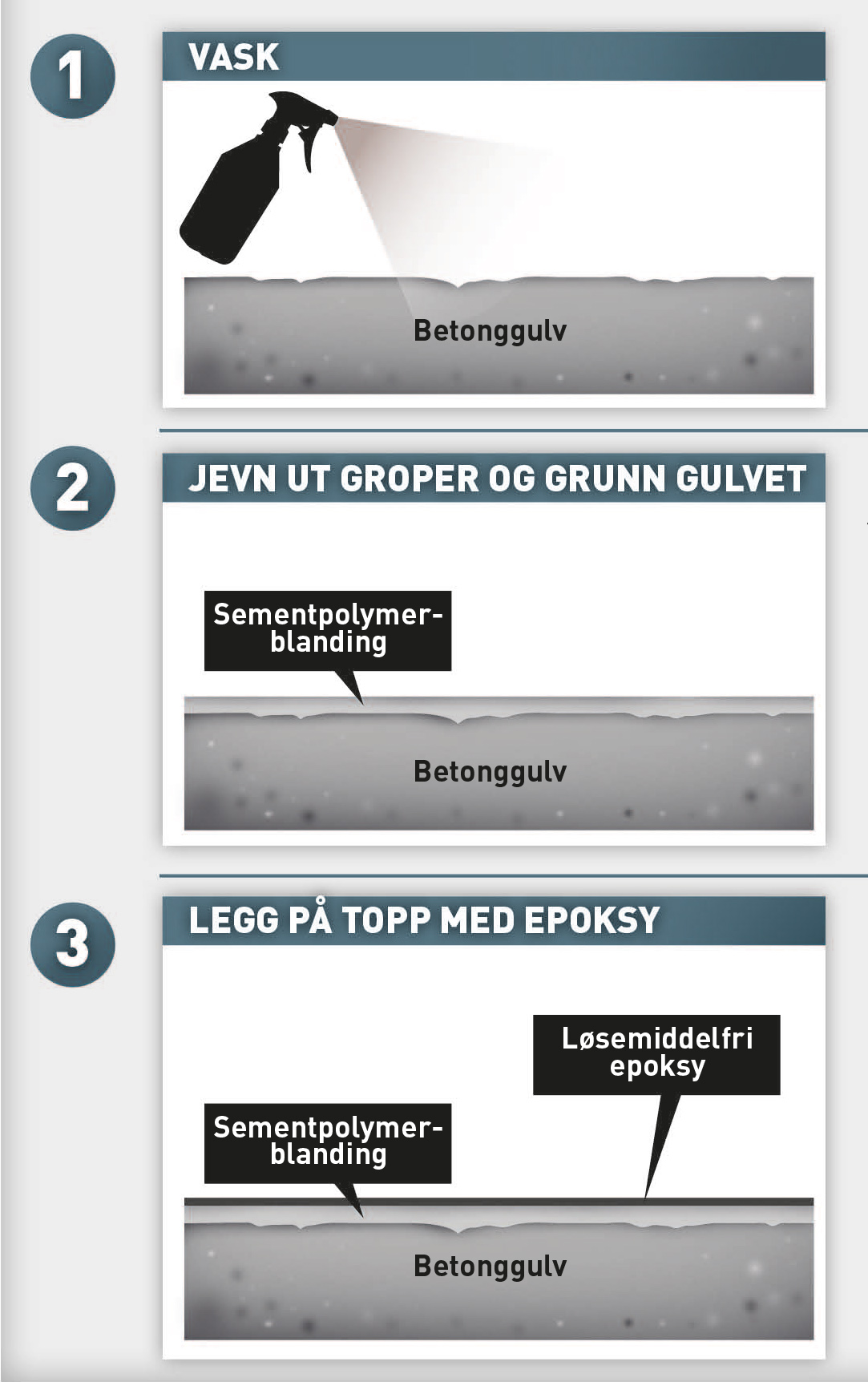 – Det er mange måter å utbedre betonggulv på; noen gode og noen mindre gode. Vi har én vi vet fungerer, sier daglig leder Per Olav Ophus i Epoxygrossisten. Han skisserer følgende tretrinnsprosess: