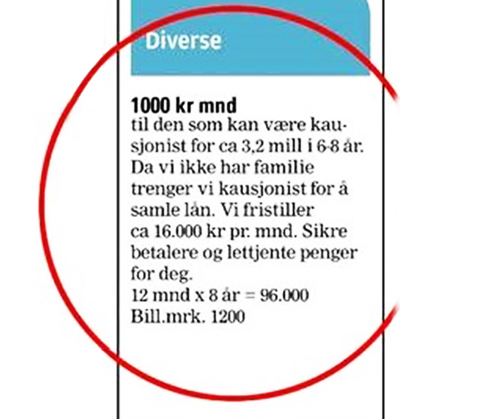 «1000 kr mnd. til den som kan være kausjonist for ca. 3,2 millioner i 6 – 8 år. Da vi ikke har familie trenger vi kausjonist for å samle lån. Vi fristiller ca. 16.000 kr pr. mnd. Sikre betalere og lettjente penger for deg. 12 mnd. x 8 år = 96.000. Bill.mrk. 1200».
