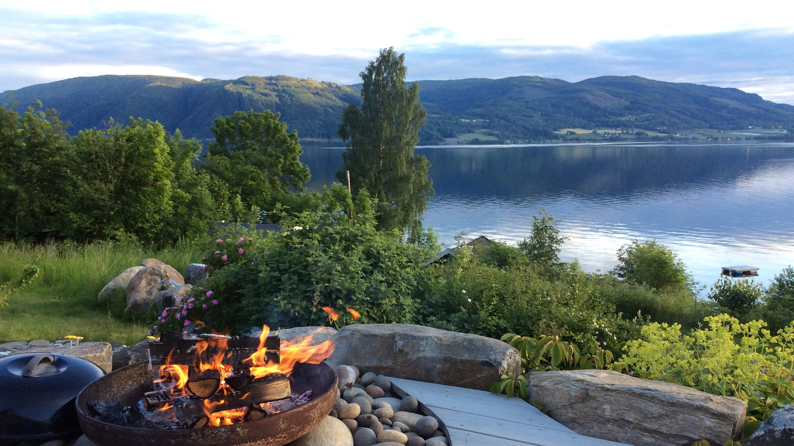 Nederst på plena har fem kampesteiner, ubrukelige noe annet sted, blitt til et hesteskoformet, vestvendt lé hvor de har plassert hjemmesnekrede pallebenker foran et ildsted.
