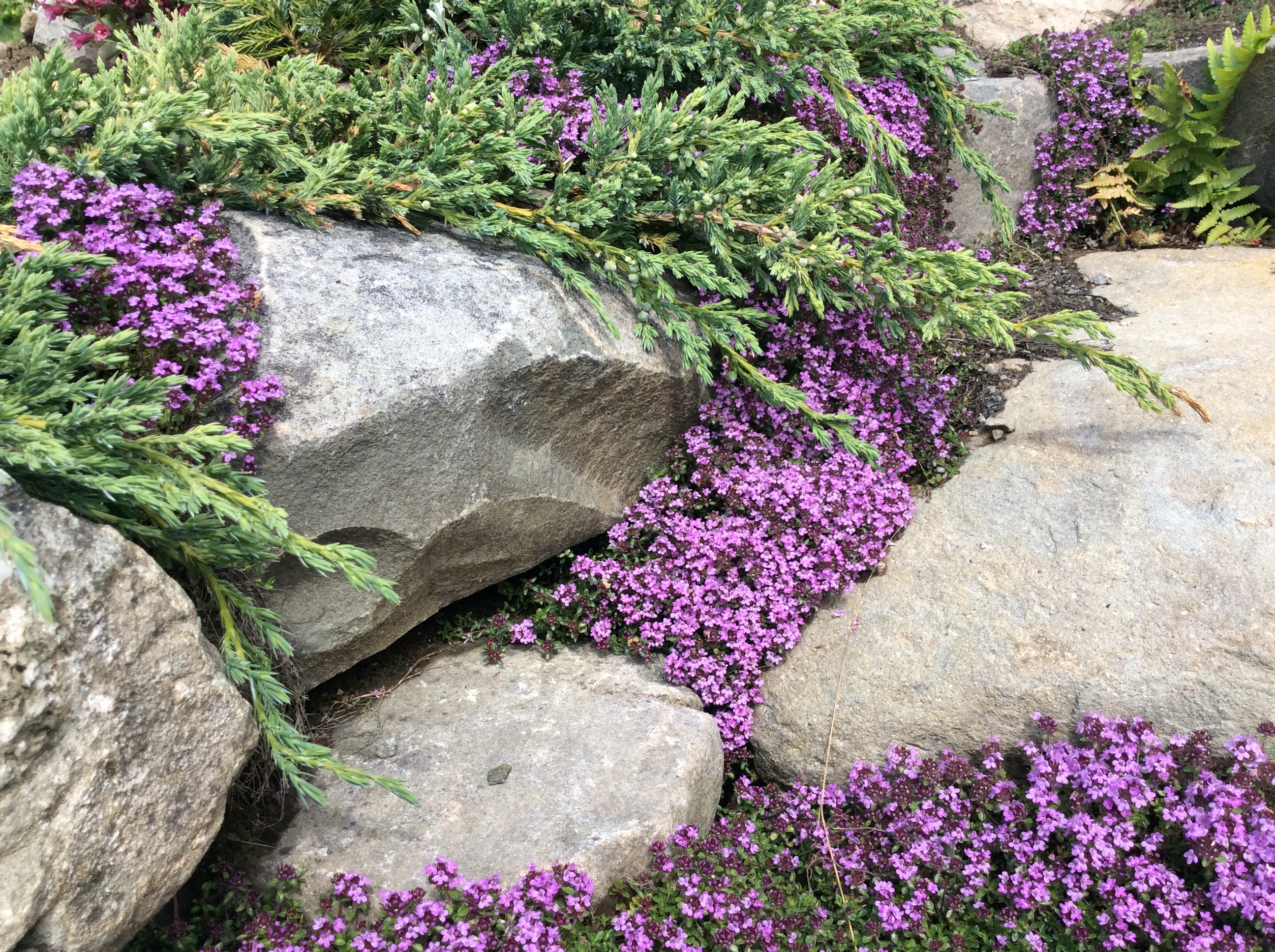I trappen innfelt i den nederste steinmuren har hun plantet timian. Der stortrives den og blomstrer tidlig på sommeren.