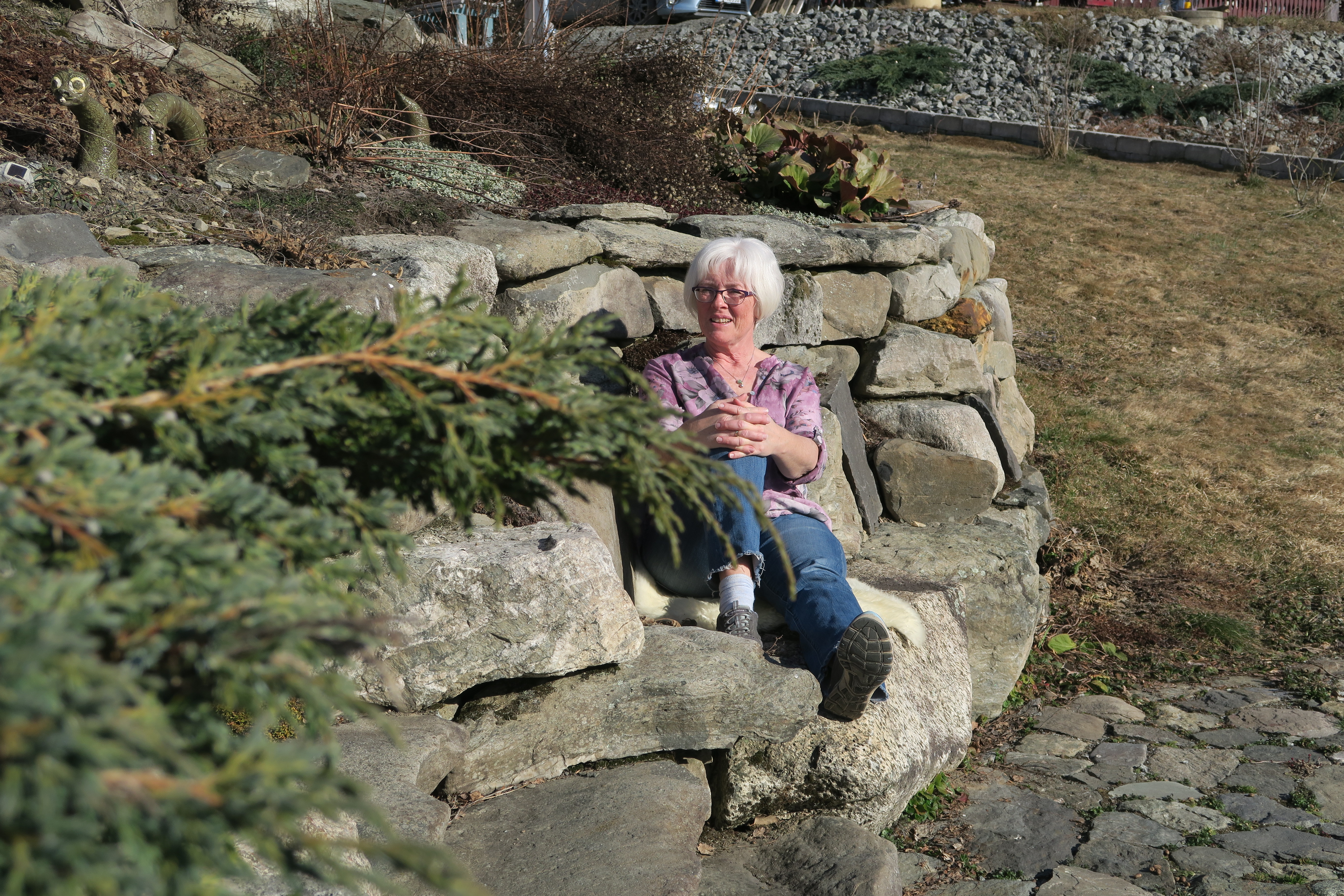 Hun er slett ikke sikker på at de minste klokkebuskene har tålt å være bespisning i tillegg til tørken, og venter spent på om de kommer seg i løpet av våren. I begge steinbedene har hun nålebusker, men har lagt vekt på at det er busker som ikke skal bli så høye. På vestsiden mot Mjøsa har de vokst seg vide, så der har hun måttet stusse dem litt.