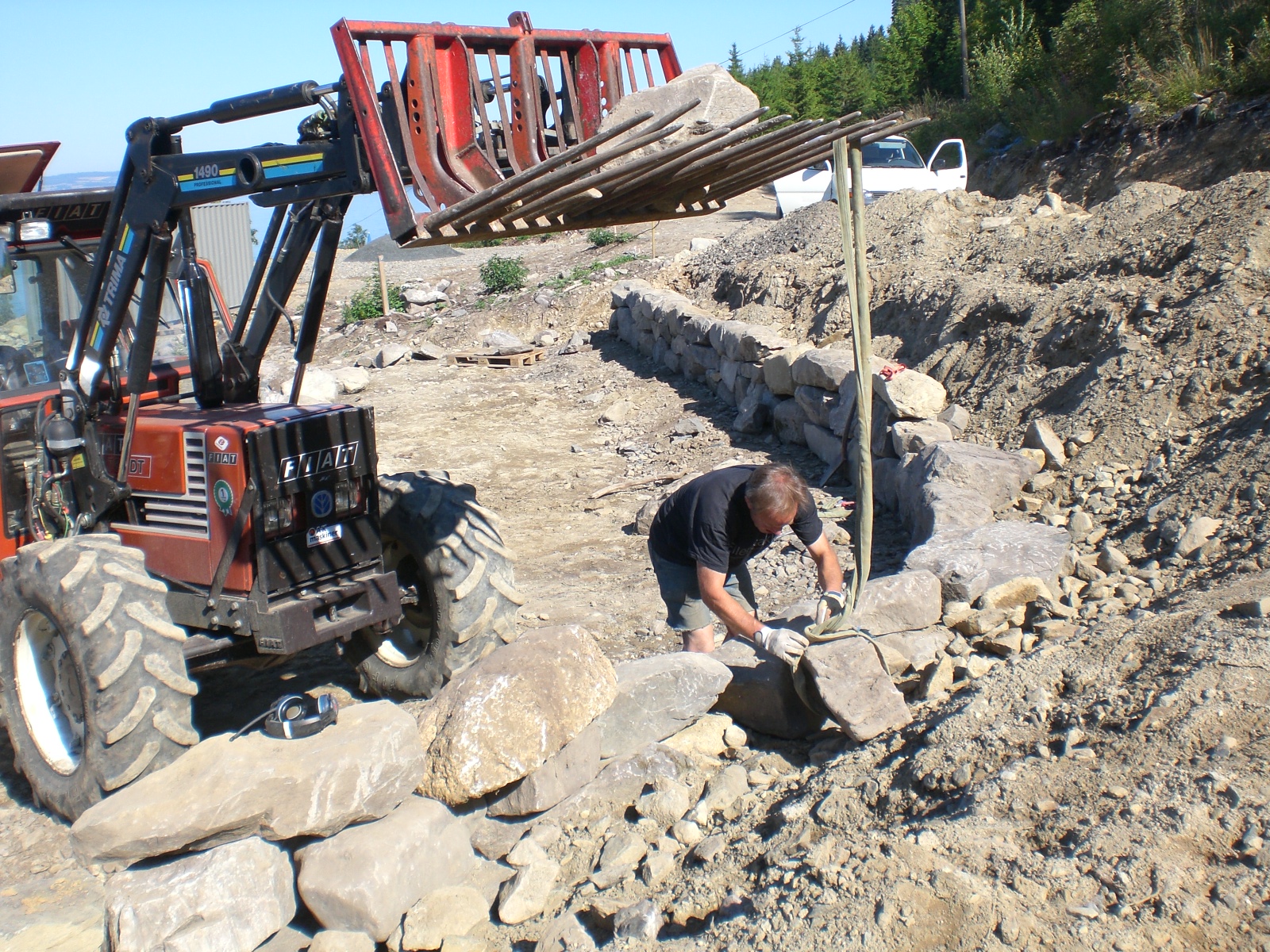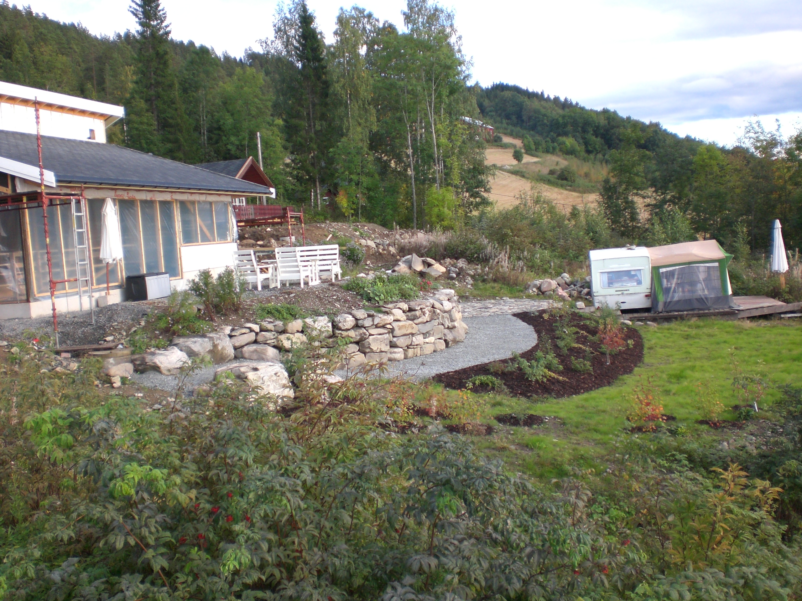 Han begynte arbeidet på steinmuren inn til gjennomfartsvegen på oversiden av tomta. For å få fraktet og løftet de store steinene på plass brukte han traktor og minihjullaster. Jobben var tung, lang og vanskelig, men han var tålmodig. Da han hadde lagt den siste steinen, var Ree-Lindstad rask til å fylle på med jord og planter. Nå sto muren på forsiden av tomta for tur. Og like raskt som den ble ferdig, fikk hun plantene på plass. Først da murene som rammet inn plassen hvor hytta skulle stå var ferdig, og beplantingen var gjort, begynte arbeidet med oppføring av hytta.