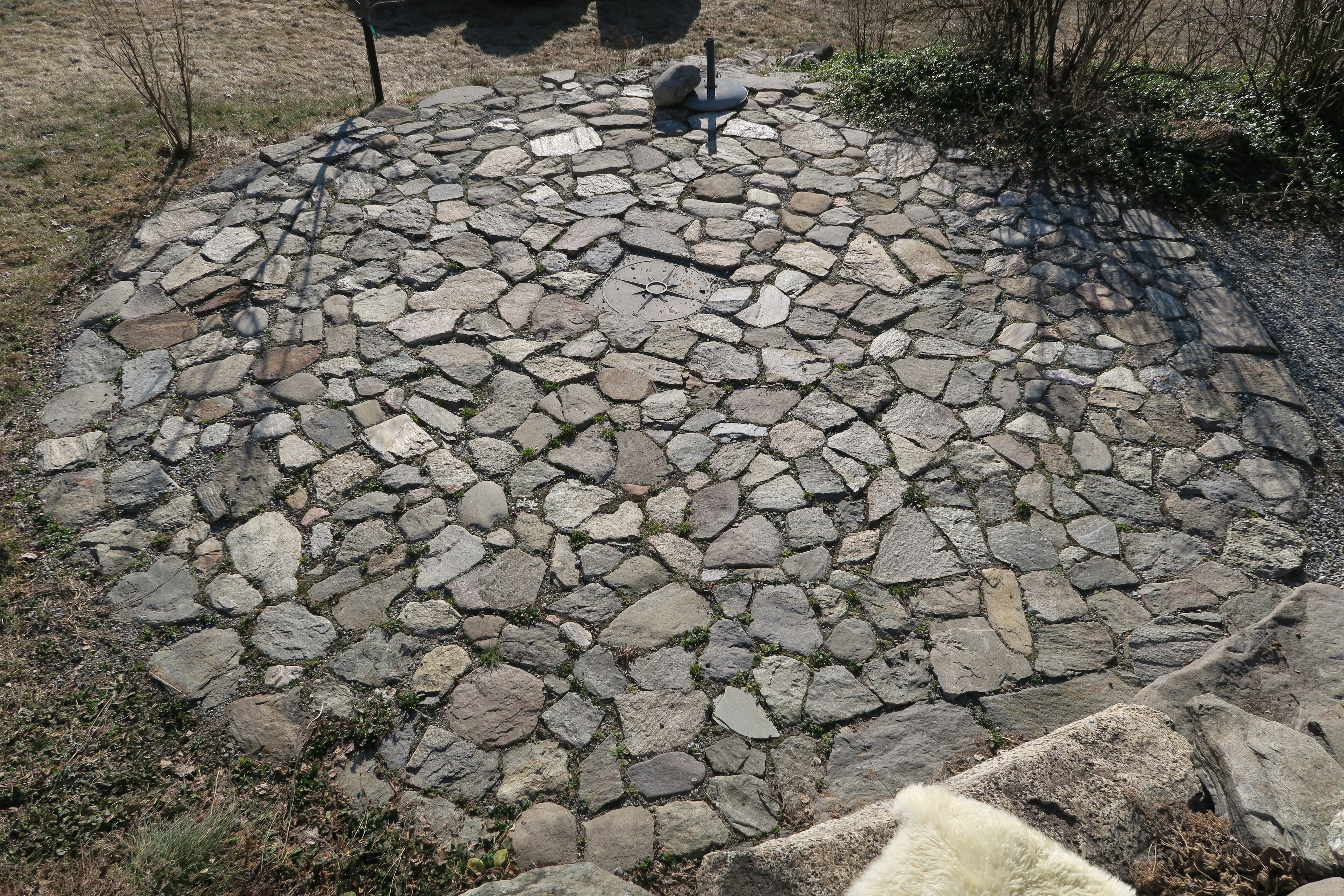 Av en onkel hadde Ree-Lindstad fått ei kompassplate i støpejern. Med all steinen på tomta, fant hun ut at hun skulle lage en steinplatting med utgangspunkt i kompasset. Med god hjelp av søsteren Signe, laget de en platting på rundt tre meter i diameter inntil den nedre steinmuren hvor ektemannen har anlagt en benk i stein som samler solvarme, og er lun å sitte på i fine kvelder i vår- og sommersesongen.