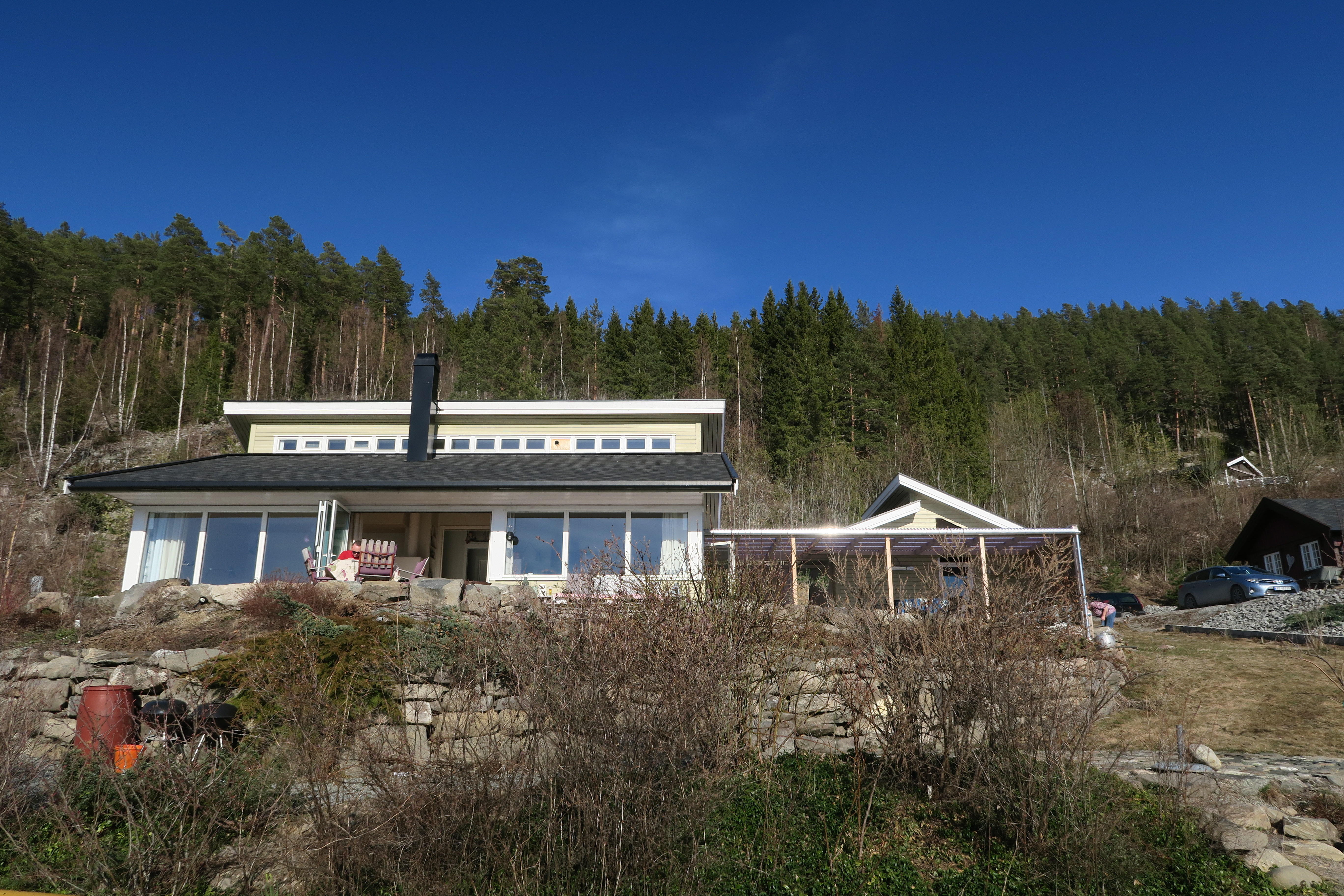 Hytta troner i den solfylte skråningen over Mjøsa. Foto: Kari Gjertrud Dølgaard