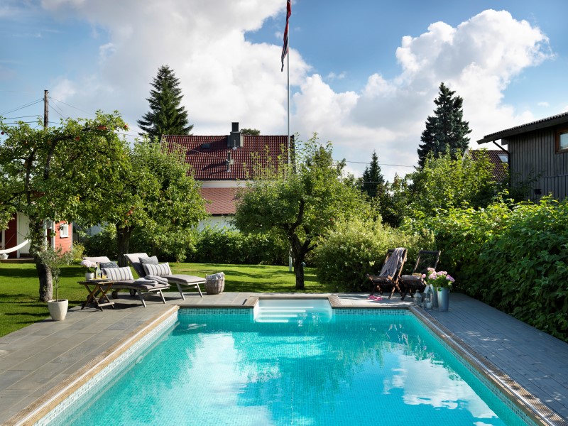 – Med en stor, deilig hage med epletrær og to badeglade barn lå det i kortene at et basseng ville være mer enn populært, forteller Marianne Frisvold Furuseth og Jan Petter Furuseth, som selv er tømmermester.