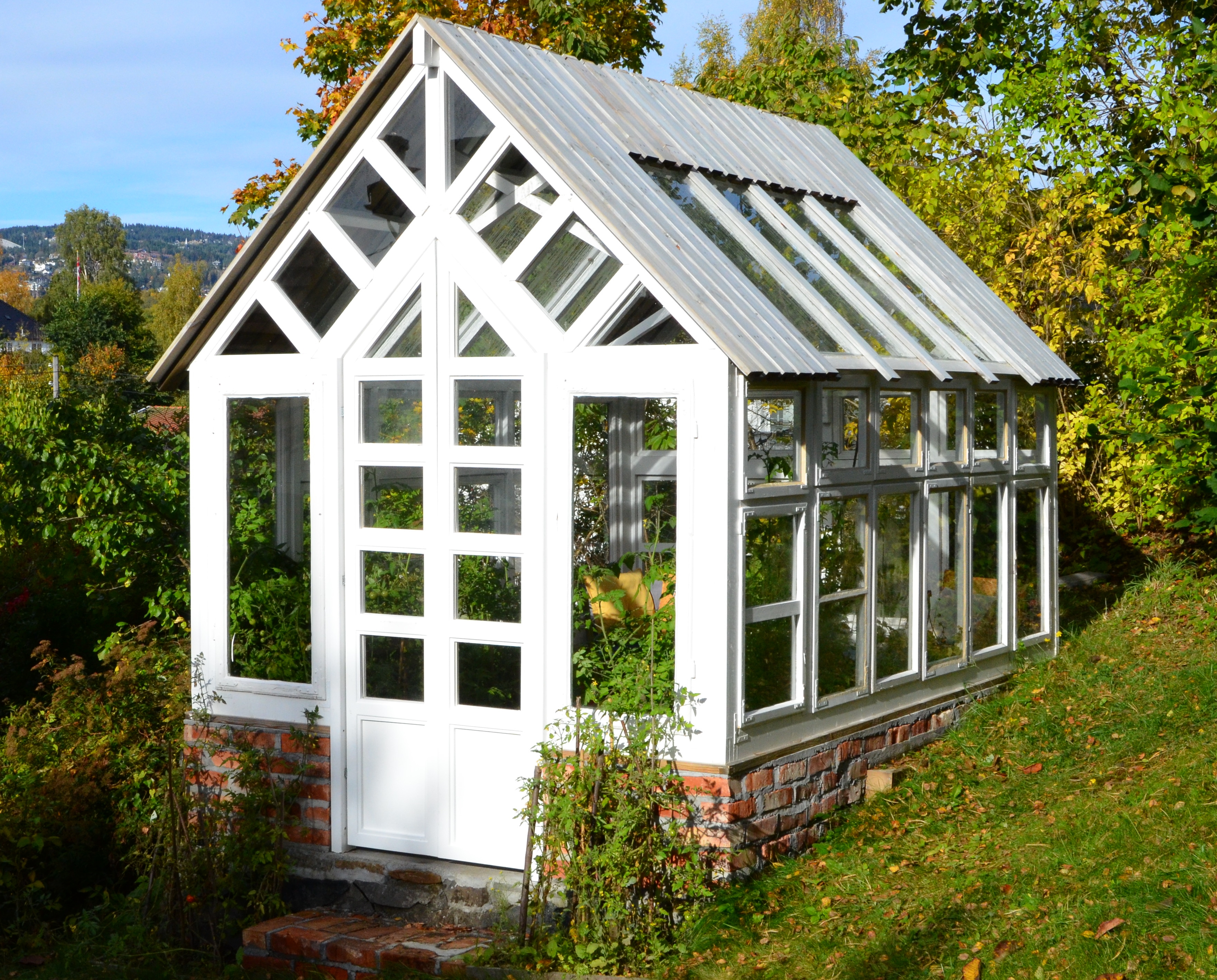 – Glass hadde jeg fra før. Da min svigerfar gikk bort, fjernet vi det gamle drivhuset i hagen, som var ganske falleferdig. Vi fikk reddet glasset, og hadde det stående i garasjen. Rutene var vel fra 1970-tallet en gang, og de var skitne og ganske medtatte, men da jeg fikk vasket dem var de helt fine. Glass varer jo mer eller mindre evig, sier Kempton.