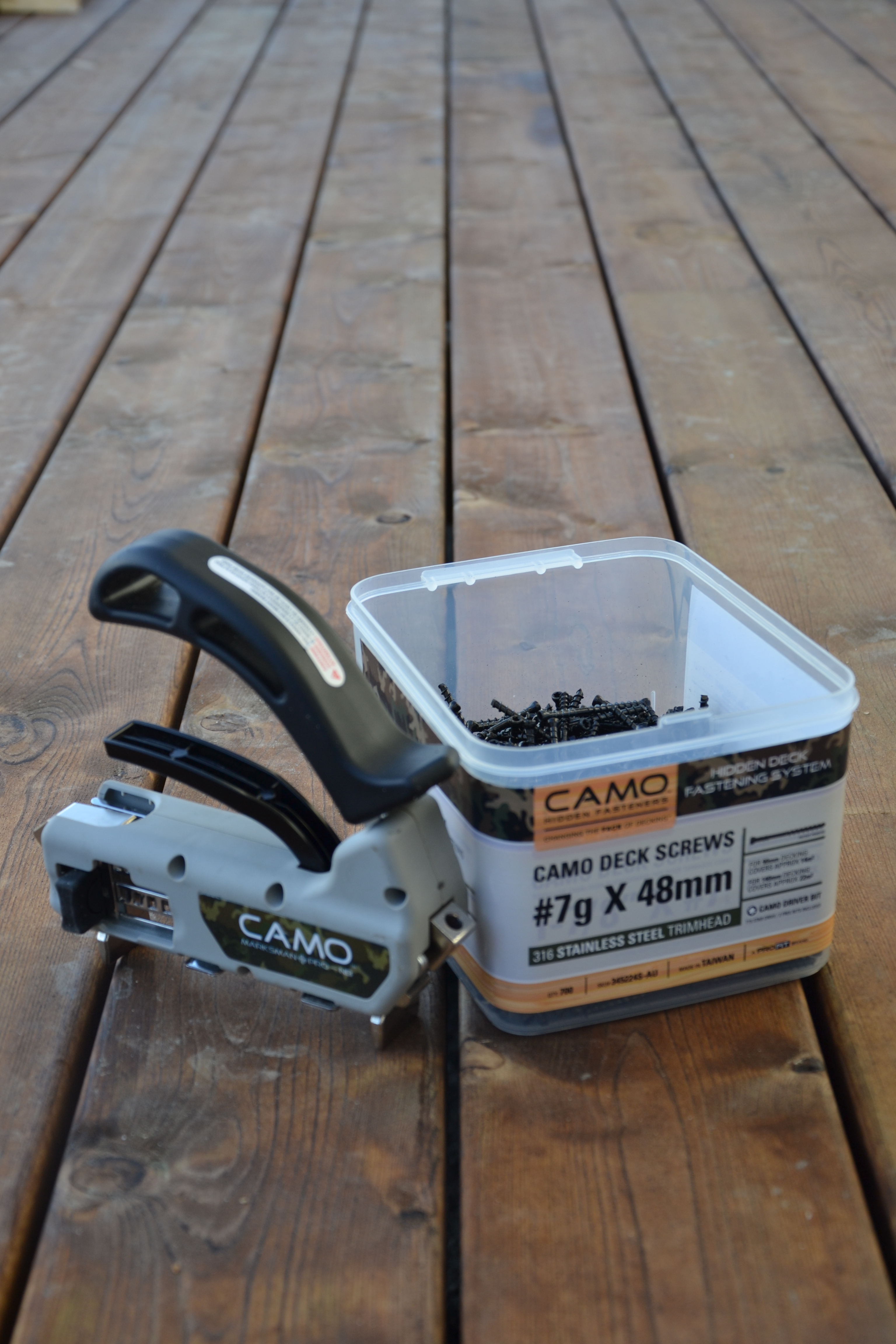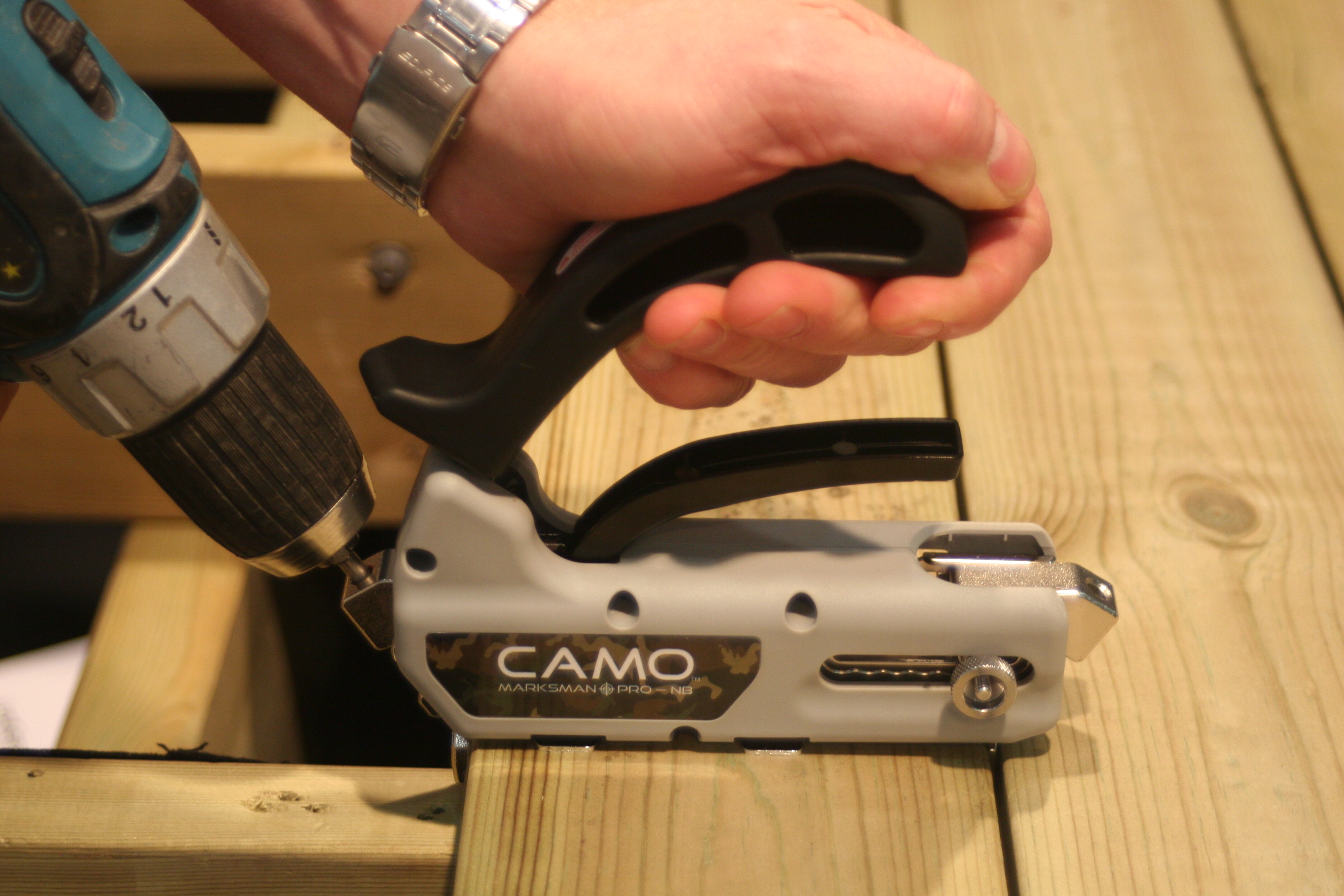 - Vi har en løsning som består av spesialskruer, spesialbits og en mal. Med dette systemet, som heter Camo, kommer skruene inn der de skal uten å ødelegge treverket. Skruene har freseskjær som gjør at bordene ikke sprekker, og systemet krever ingen forboring. Dermed sparer man en masse tid under arbeidet, sier daglig leder Arne Franck-Pettersen i Terrassespesialisten.