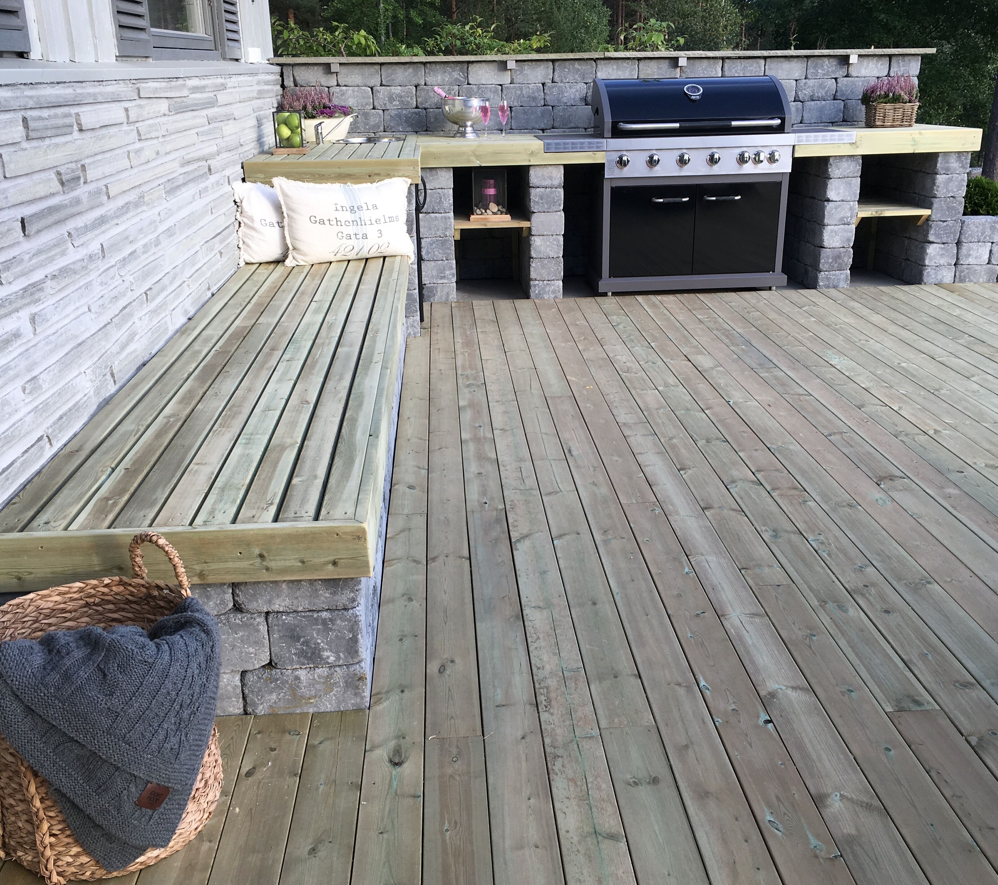Har du godt med plass på terrassen, liker stein og et rustikk utrykk, er denne kjøkkenløsningen både enkel og rask å lage. Velger du å lage en romslig og praktisk benk som her kan du plassere et spisebord foran. Foto: ASAK miljøstein