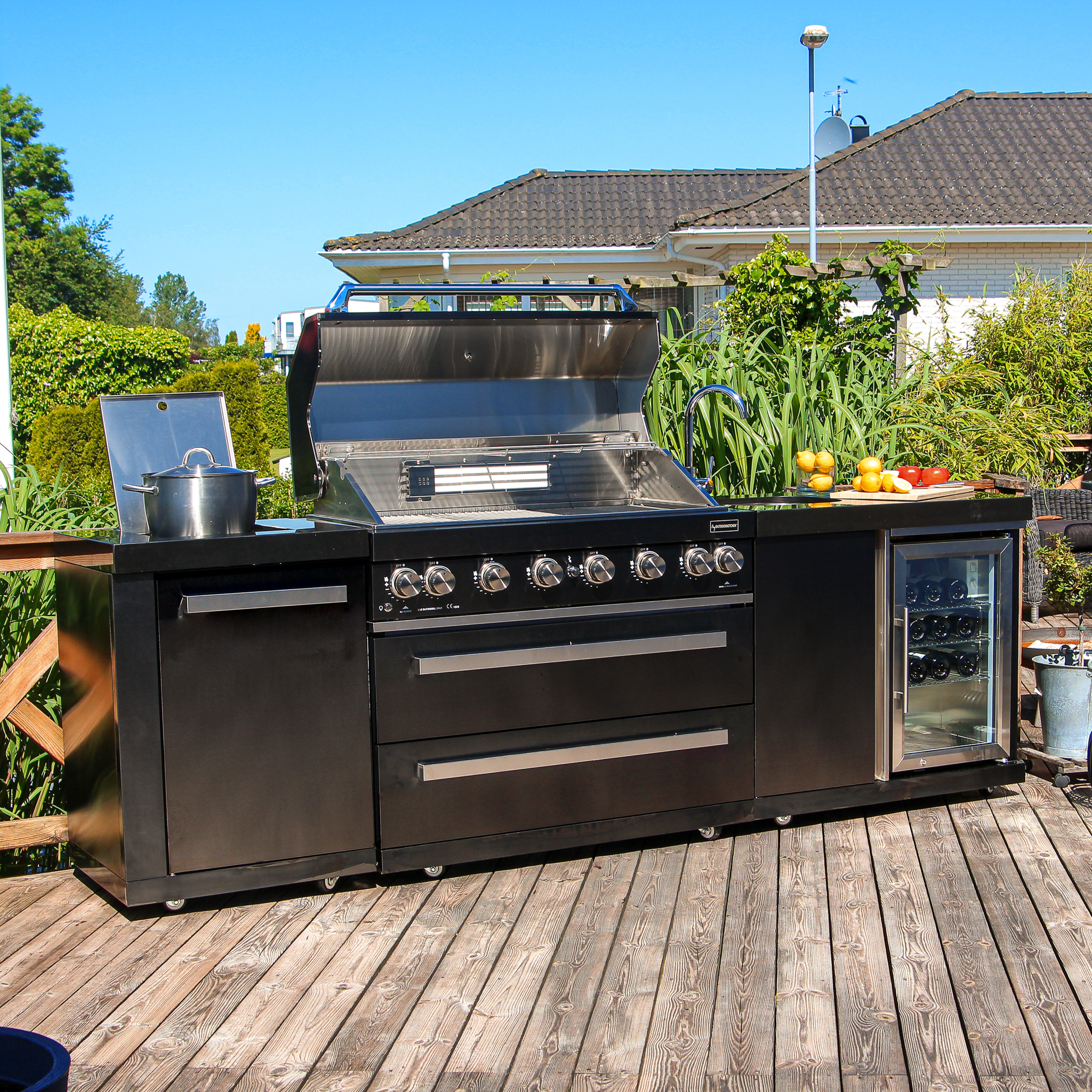 Har du lyst på noe mer ekslusivt? Nettstedet myoutdoorkitchen.no selger modulpakker. For 44 000 kroner kan du flotte deg med denne modellen kalt Oklahoma, som har en arbeidsflate i stein, en frittstående gassgrill med infravarme og 6 brennere, en sidebrenner samt en kjøle- og vaskemodul med oppbevaringsplass.
