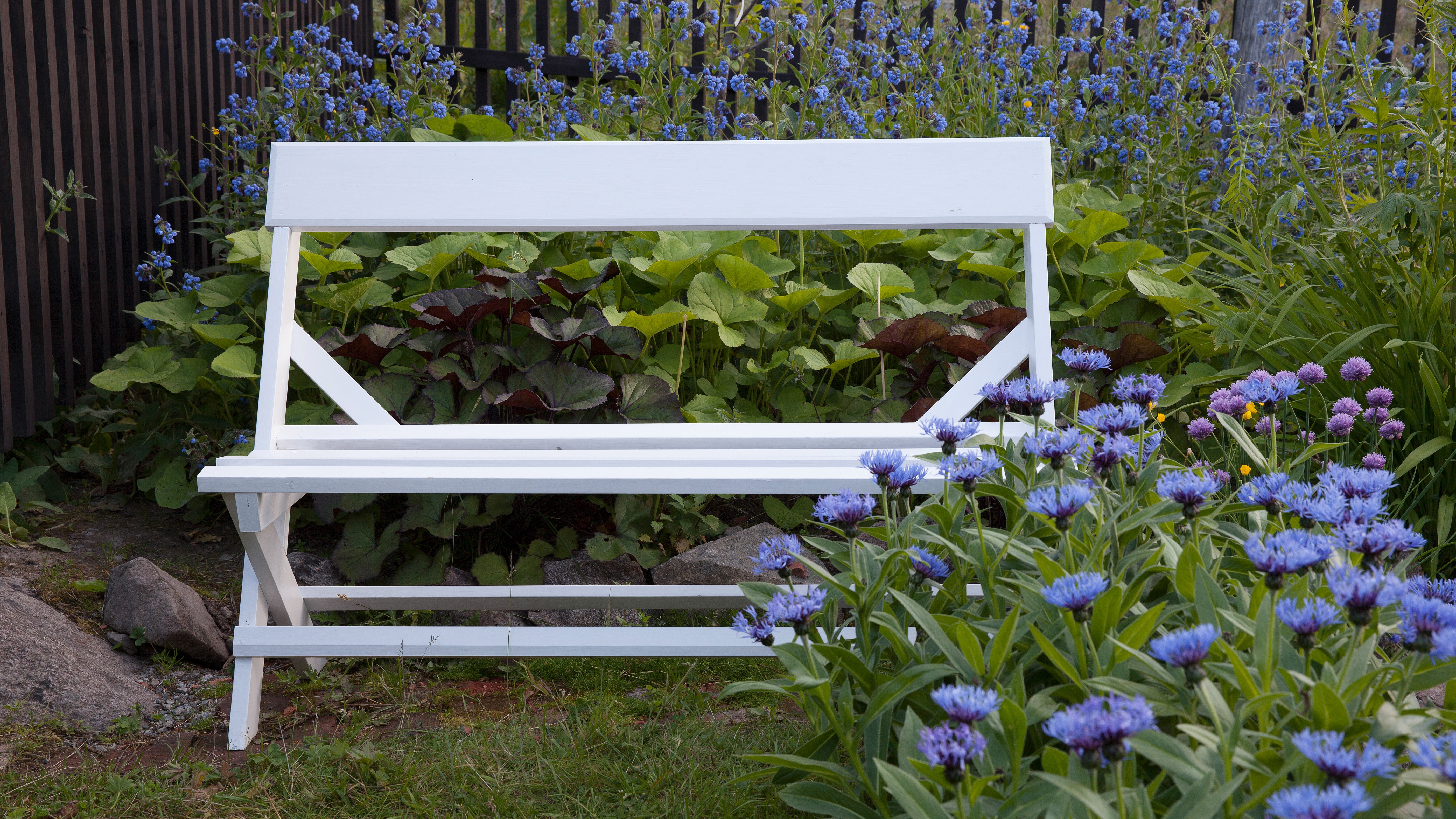 På en oppbygd steinterrasse bak villaen Sangen i Hamar, fant Sjur Harby modellen til denne benken som naturlig nok heter Sangen. Foto: Steffen Laursen
