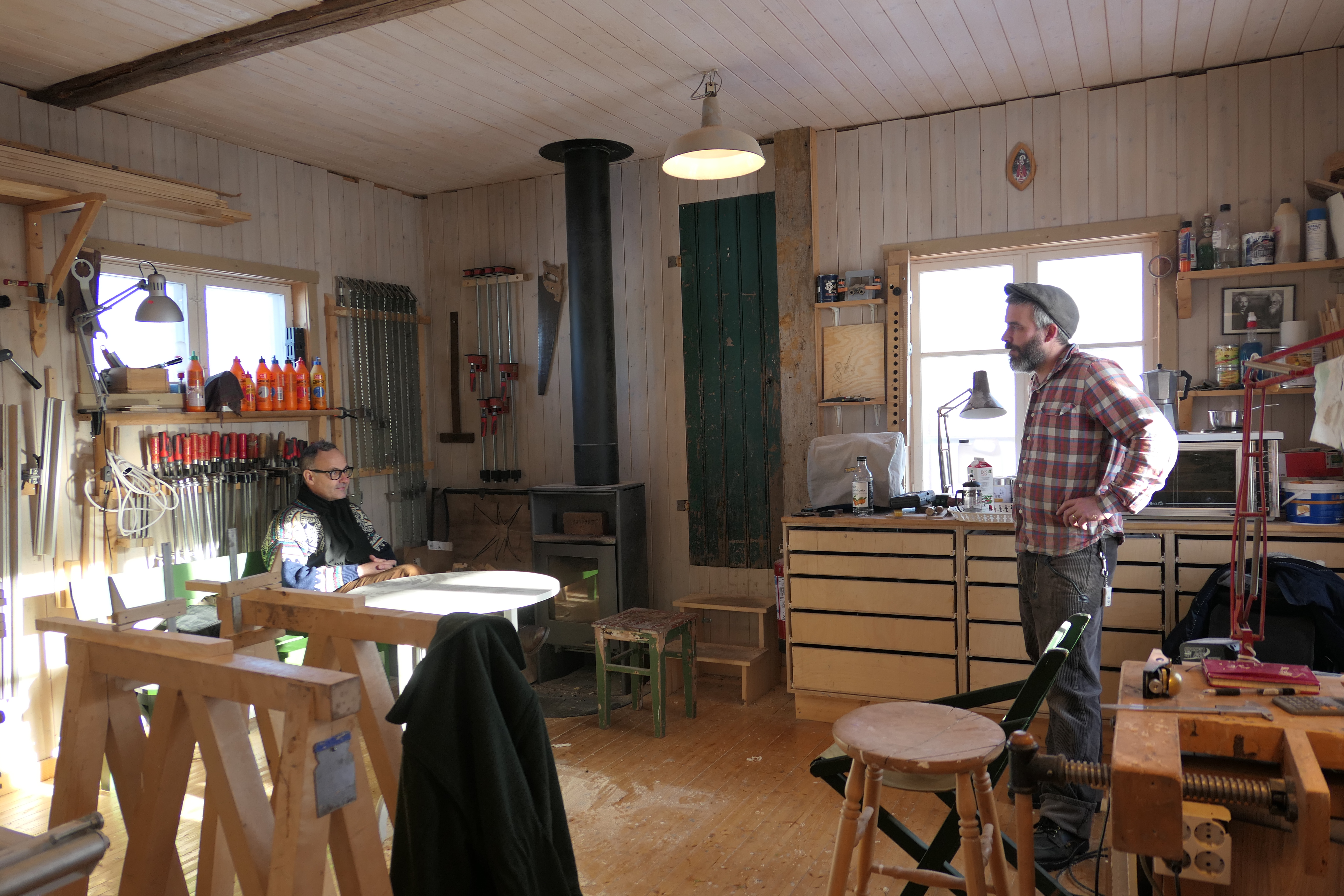 Sjur Harby og møbelsnekker Thomas Arthur Andresen diskuterer nye modeller i snekkerverkstedet i Almsgutua i Stange. Foto: Kari Gjertrud Dølgaard