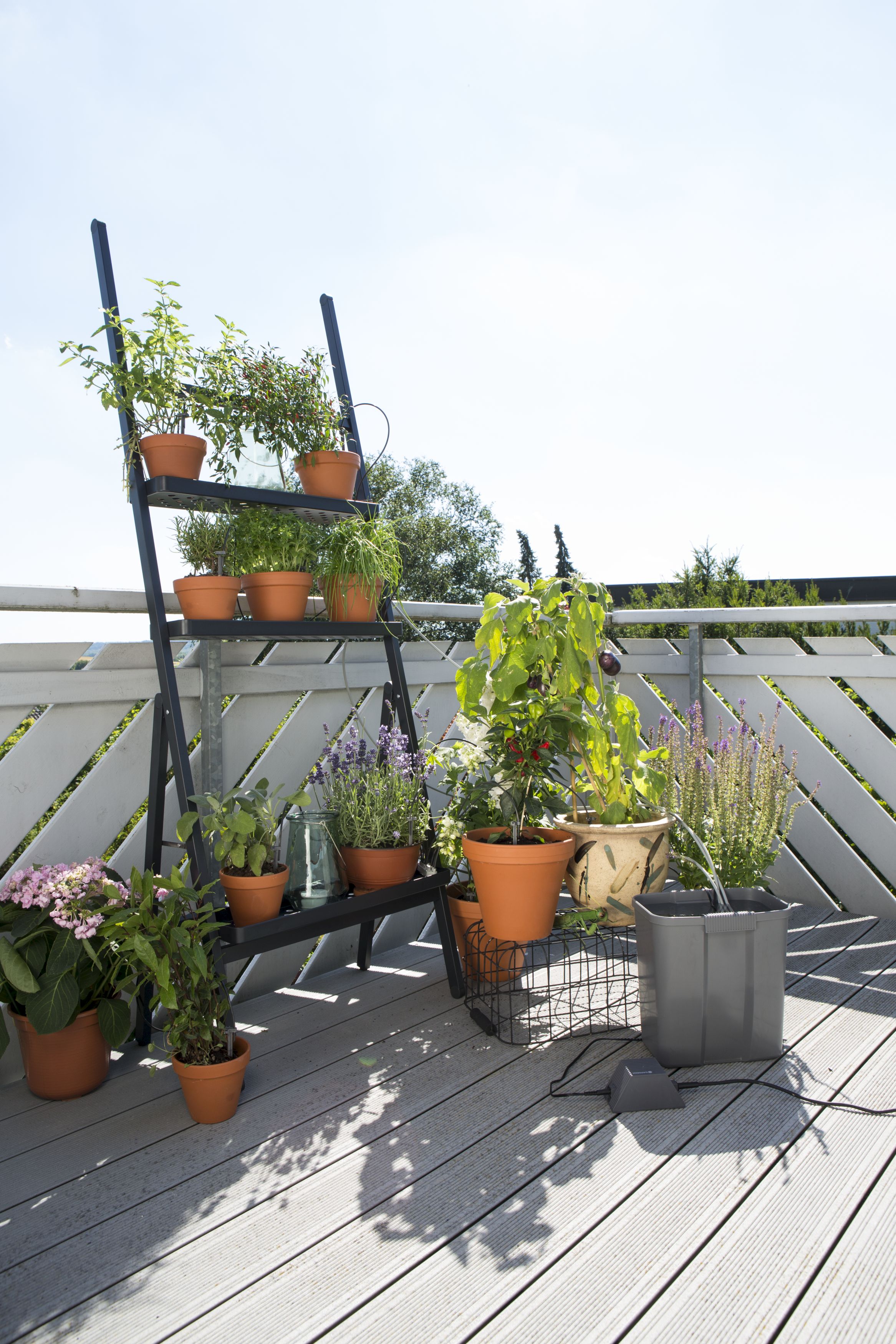 Et feriekit som dette koblet til en vanntank kan vanne opptil 36 potteplanter. Foto: Gardena