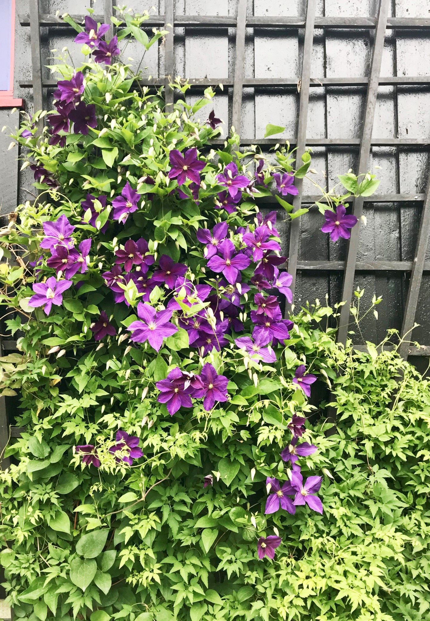 Klematisen vokser ikke rett på veggen, som for eksempel villvin. Den trenger en espalier til å klatre i.