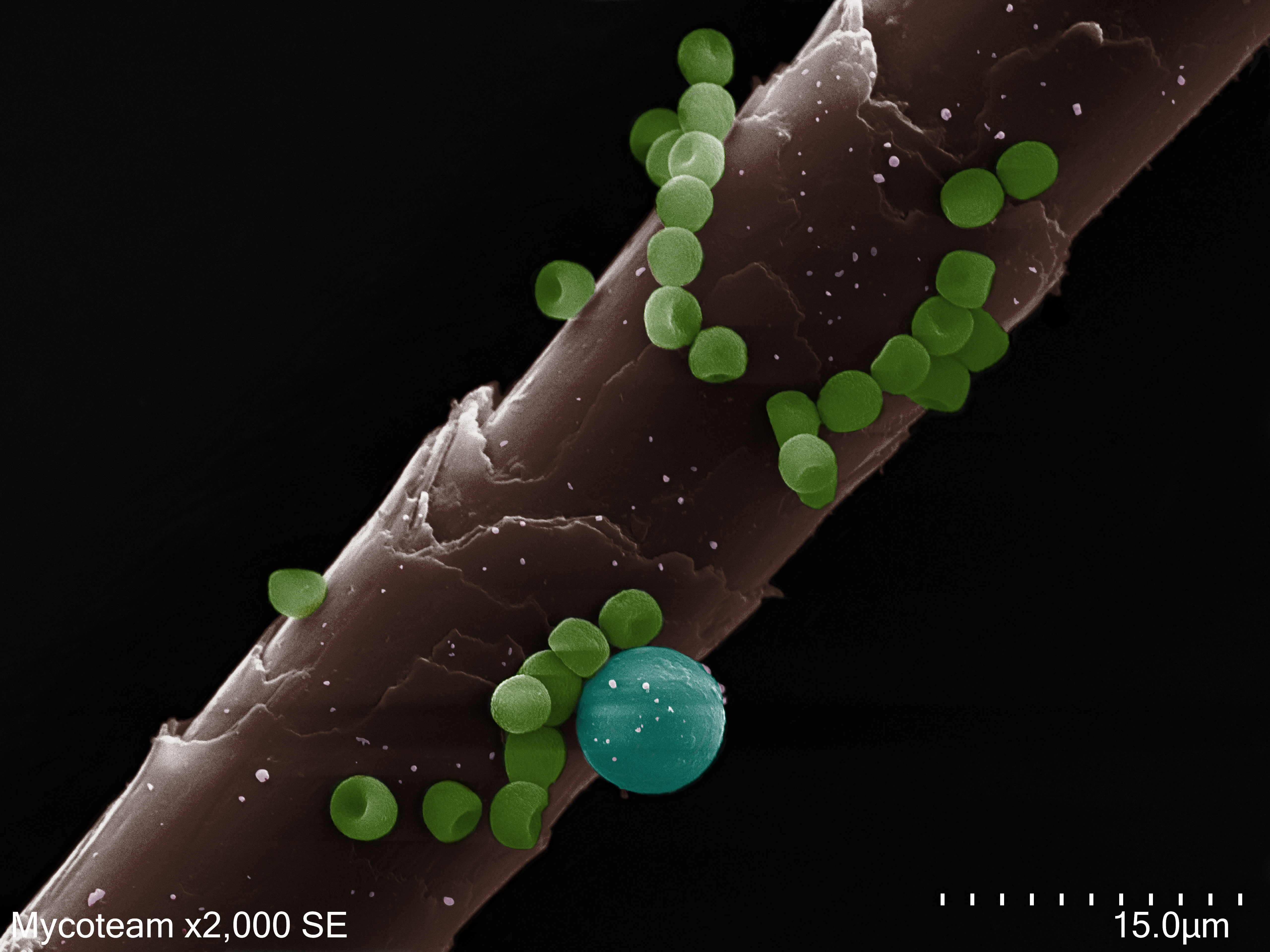 Hårstrå med soppsporer (grønne) og et pollenkorn (blålig). Foto: Mycoteam.