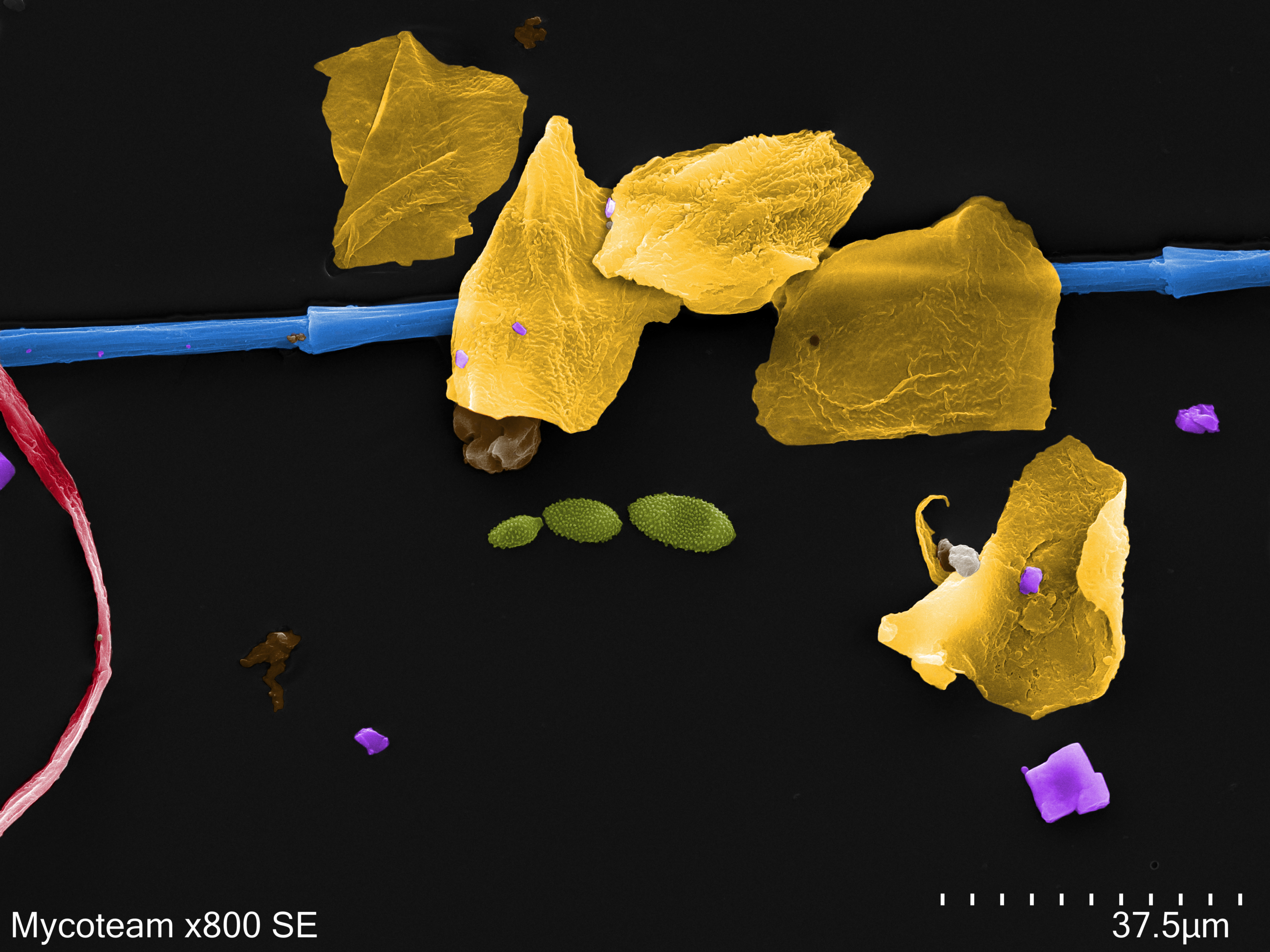 Husstøv med flere hudceller (gult), et dun fra boblejakke (blå), bomullsfiber (rød), soppsporer (grønn) og saltkrystaller (lilla). Foto: Mycoteam