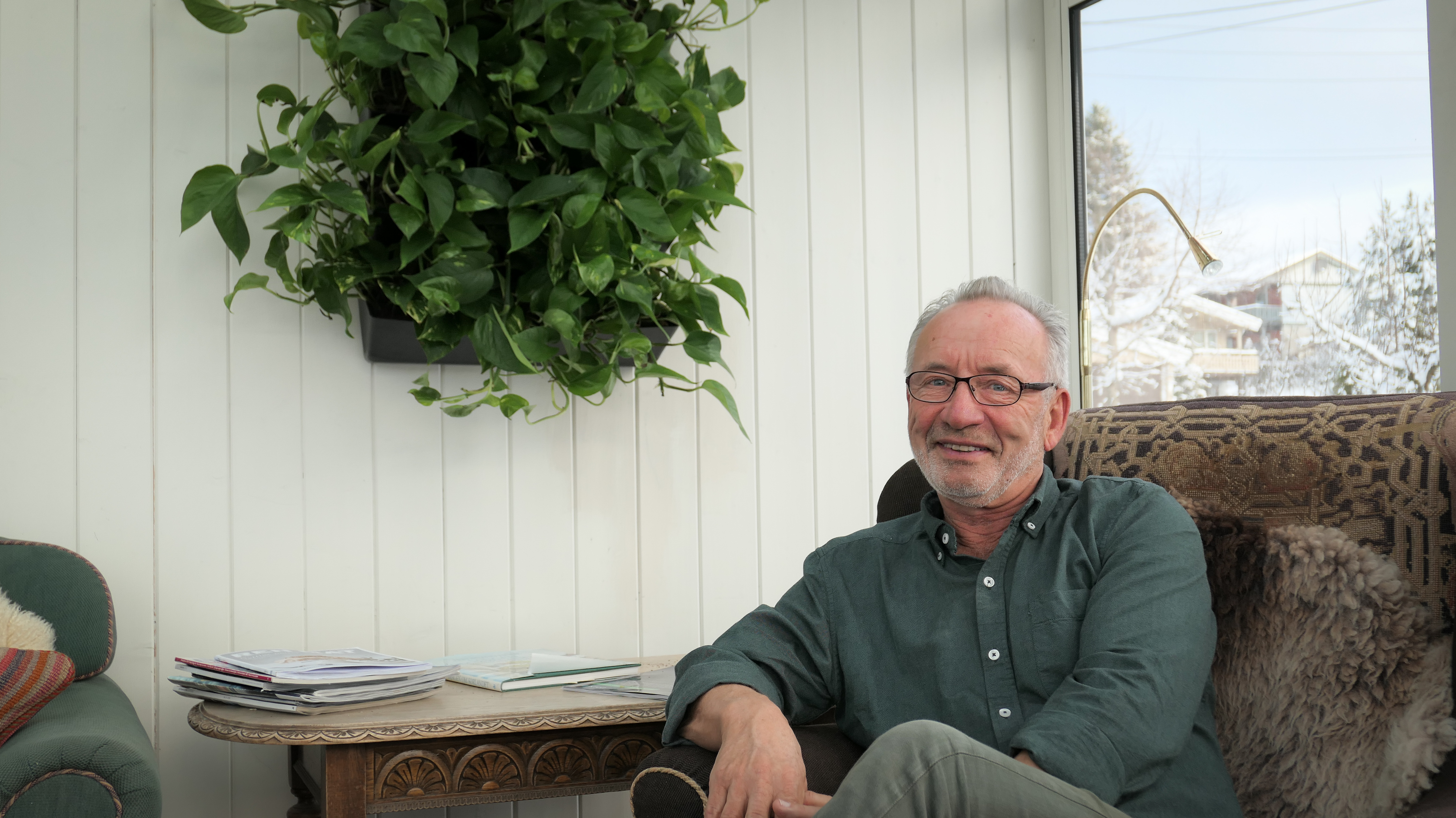 Hus & Bolig møter ham på hjemmekontoret – en koselig vinterhage oppvarmet av en sprakende vedovn. Store vinduer slipper lyset inn. Lånetøfler av ull varmer føttene. På den ene veggen henger en liten firkant med grønne blader. Den skal vi komme tilbake til. Vinterhagen er et godt sted å være. Viumdal selv har friske kinn etter å ha vært ute og gått sin faste, halvannen times morgentur.