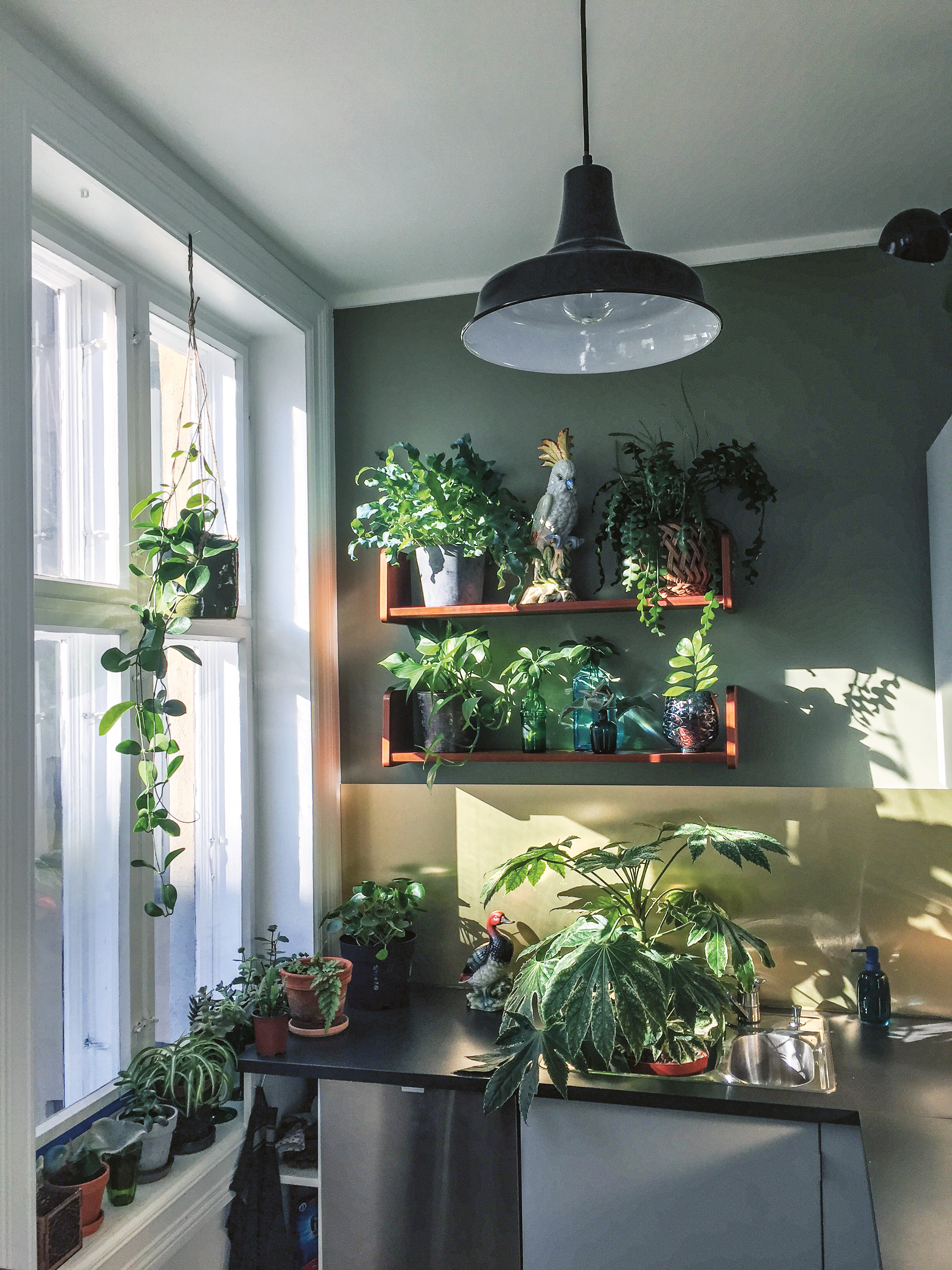 Røynebergs leilighet er fullt av grønt liv. (Foto fra boka.)