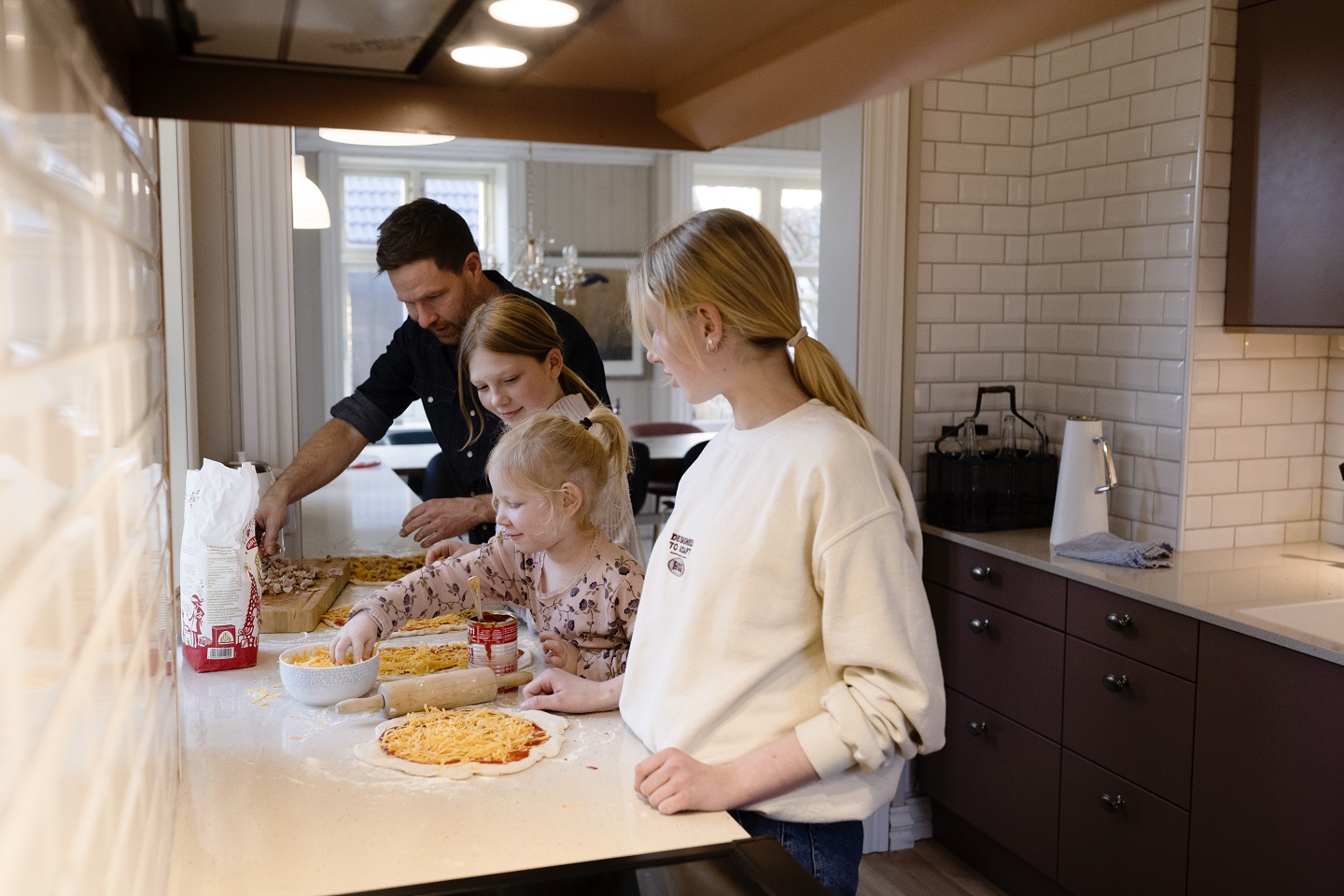 – Det opprinnelige kjøkkenet var altfor lite. Men vi lurte lenge på hvordan vi skulle løse det. Til slutt kom vi til veldig flinke folk hos Designa, som blant annet foreslo den lange kjøkkenbenken ved vinduene ut mot hagen. Den går gjennom både det gamle kjøkkenet og ut i det som var grovkjøkkenet – og den er vi utrolig fornøyd med! Her kan vi stå på rekke og rad og gjøre klar pizzaene til lørdagskvelden, sier Sodeland.