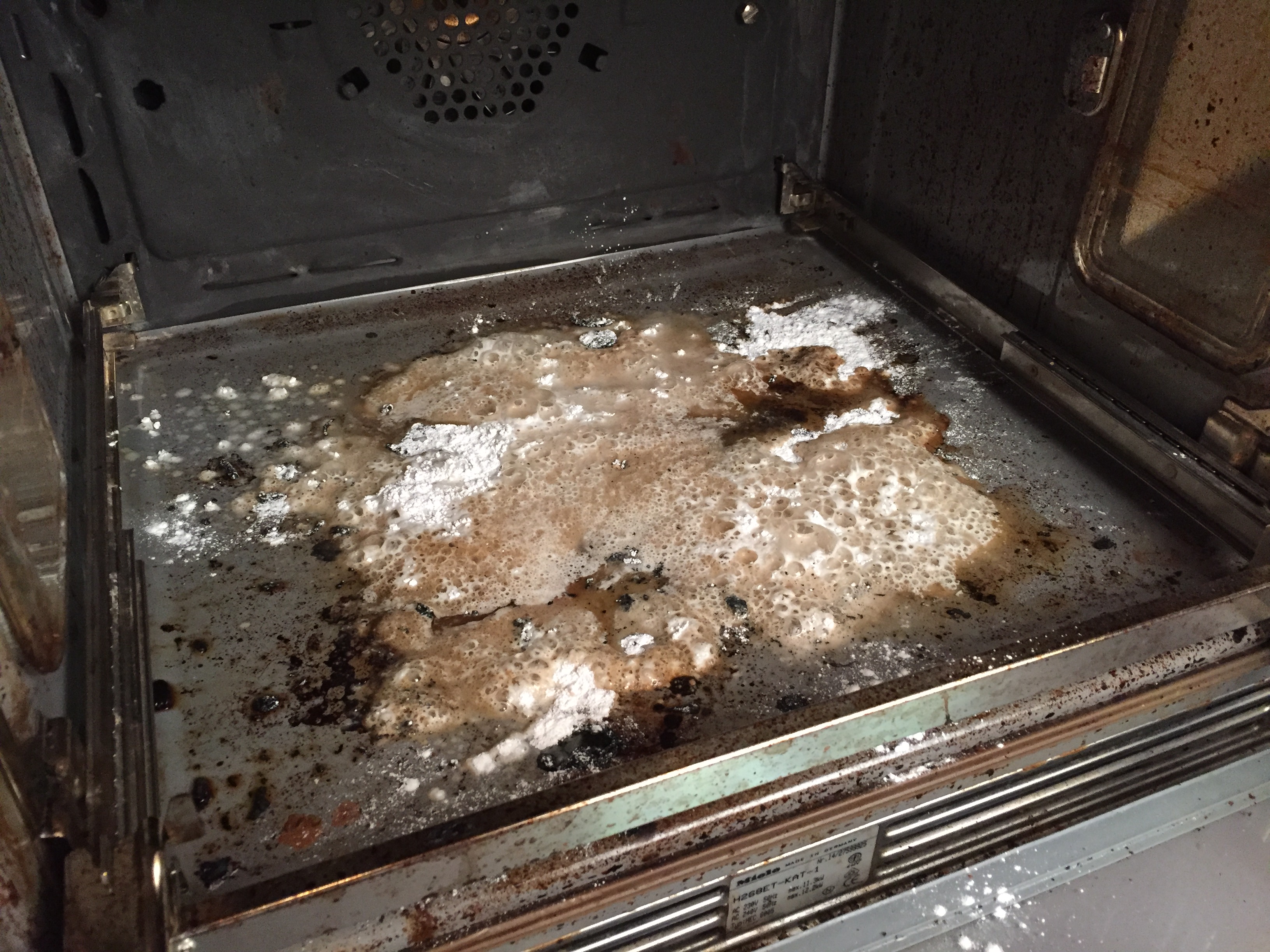 Mye av det fastbrente hadde løst seg opp, men i bunnen av ovnen hadde vi nå en tyktflytende grøt som måtte ut
