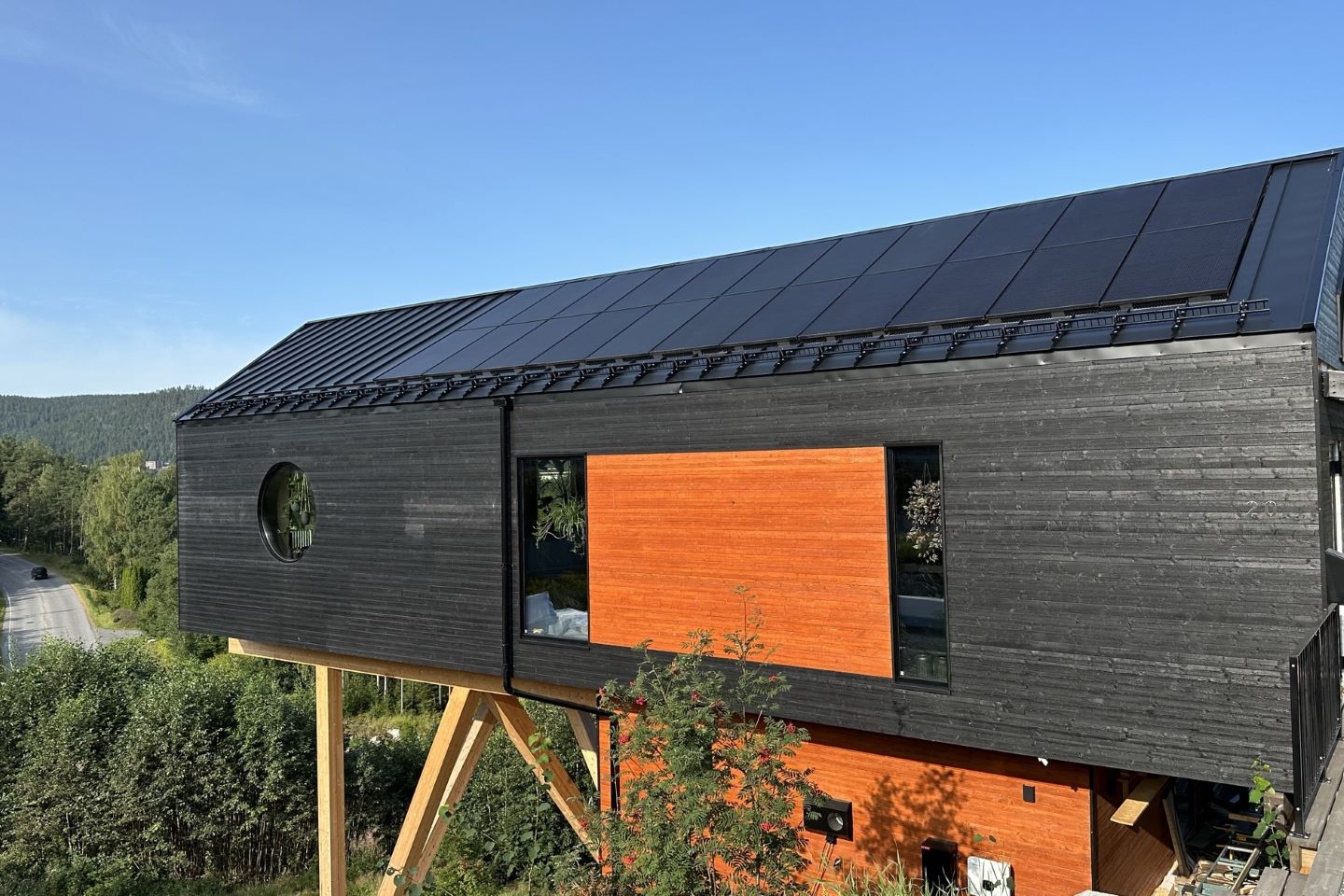 - Siden vi bygde nytt, og ikke hadde noe tak å legge solcellene oppå, har vi valgt integrerte solcellepaneler. Det vil si at solcellepanelene er vanntette og erstatter takstein, forklarer Dokka.