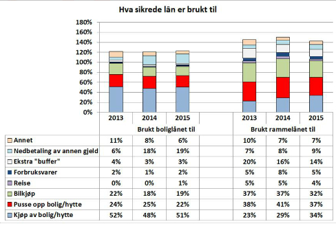 Blant de som har svart i SIFOs spørreundersøkelse, sier 51 prosent at de har brukt boliglånet til kjøp av bolig eller hytte, mens 34 prosent har brukt rammelånet til samme formål. Samtidig sier 19 prosent at de bruker boliglånet til nedbetaling av annen gjeld, mens 9 prosent betaler annen gjeld med rammelånet. 22 prosent pusser opp for boliglånet, mens 37 prosent sier de pusser opp for rammelånet.