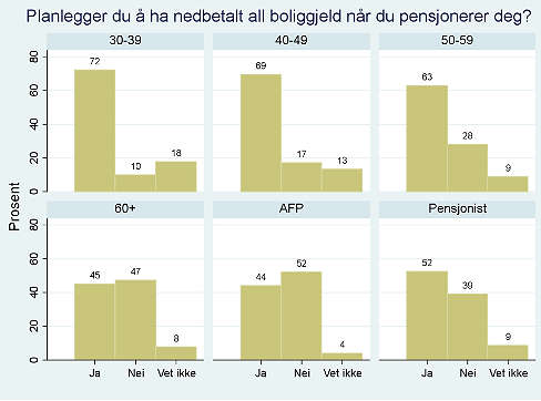 Undersøkelsen har samtidig også spurt nordmenn om deres utsikter i forhold til gjeld når de blir pensjonister. 90 prosent av de spurte i 30-årene planlegger å være gjeldfrie når de når pensjonsalder.