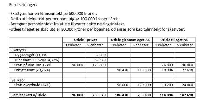 Løsningen kan være mer effektiv enn å la aksjeselskapet eie leilighetene, fordi den inntekten som «dobbeltbeskattes» gjennom utbytte fra selskapet blir vesentlig lavere når du eier leilighetene selv - gitt at selskapets overskudd blir lavere.