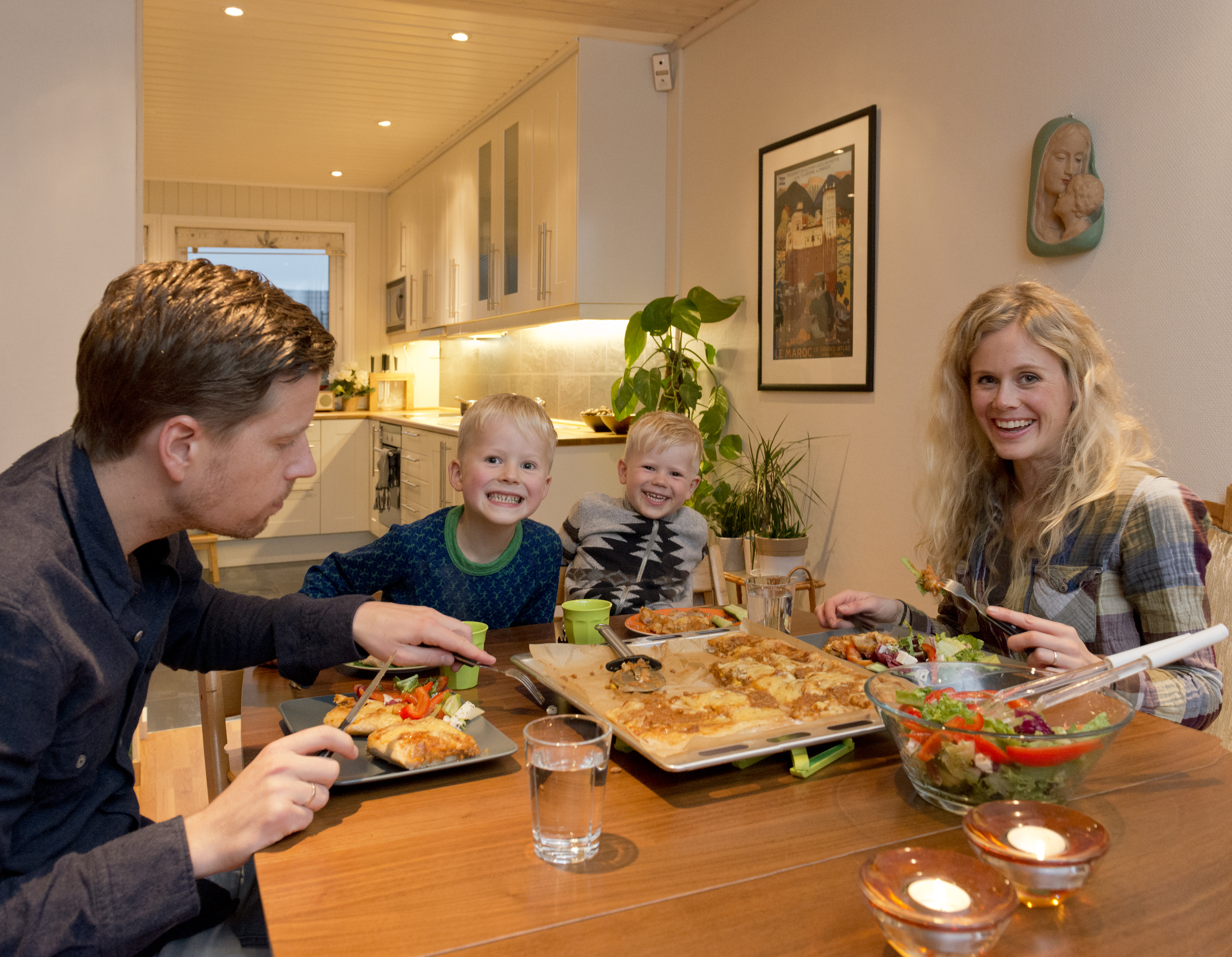 Tilbake på Jeløy rundt middagsbordet sitter familien Rognstad Sveen og smaker på tilværelsen. Hjemmelaget pizza var Sindres og Sofus’ valg og dagen etter skal far i huset tilbake på jobb i utlandet.