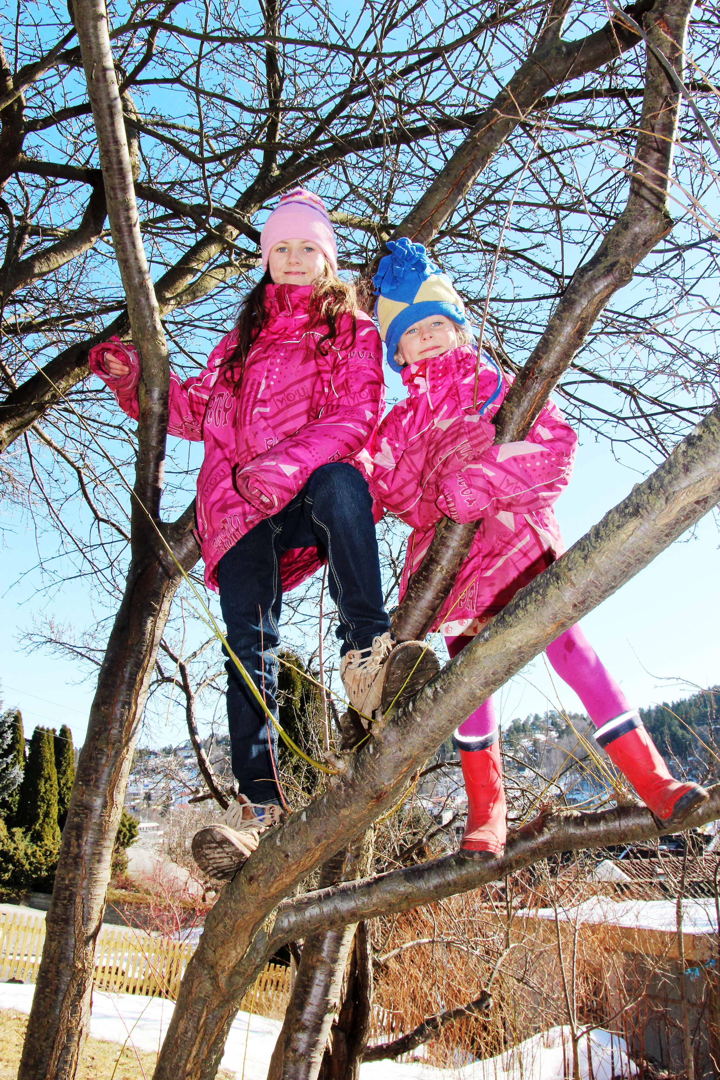 LEKEPLASS: Mens de voksne krangler, leker åtte år gamle Sofie-Aleksandra og fem år gamle Milena i trærne i hagen. Foto: Linda Ørstavik Öberg.