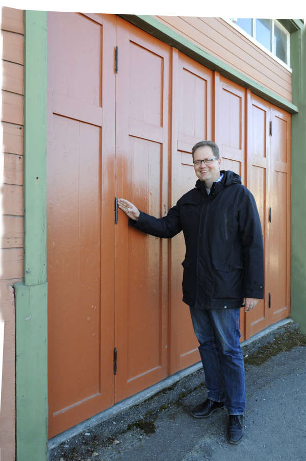 Kjetil Hveding viser oss de originale detaljene på bygget; panelet, jern og hengsler som er bevart.
