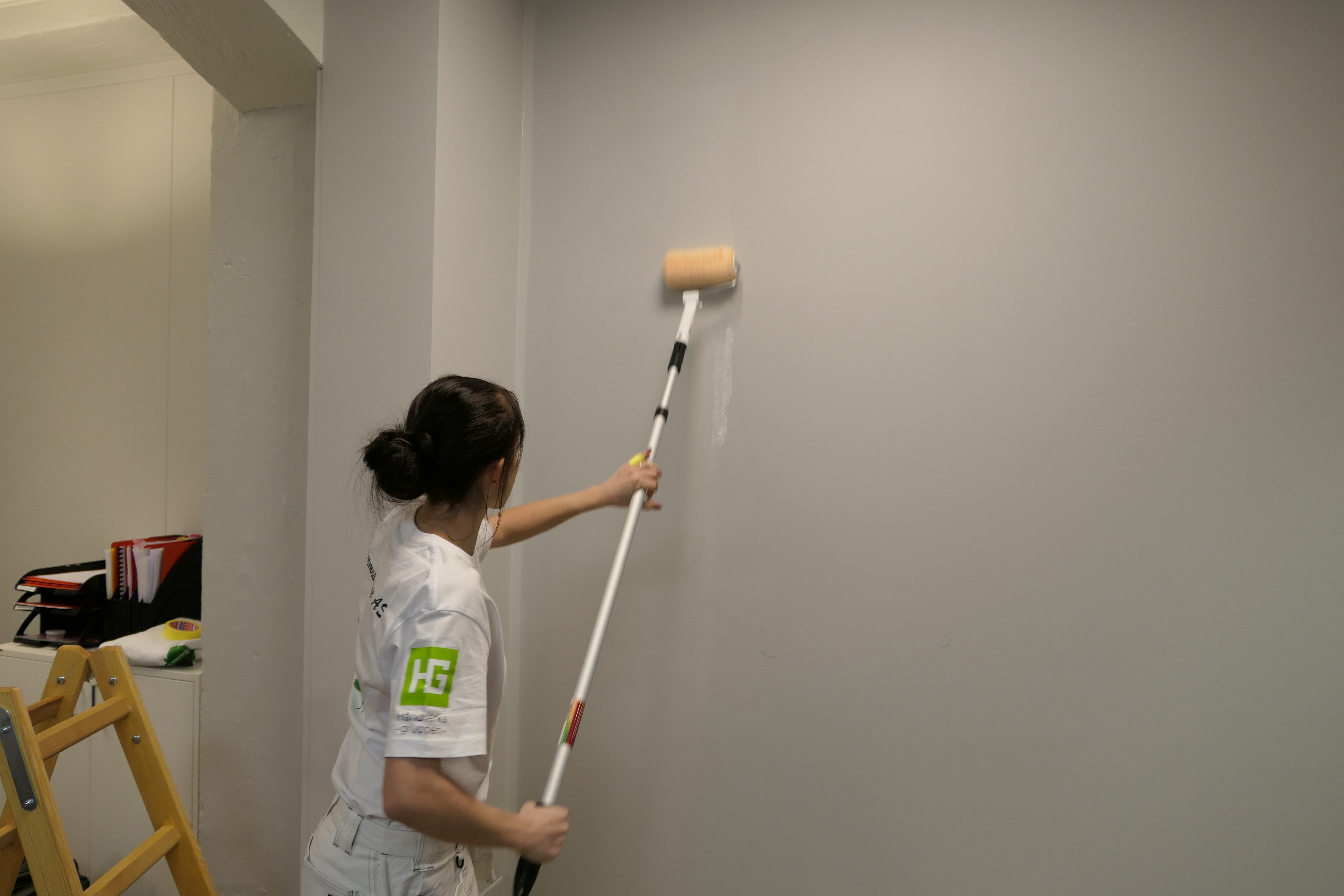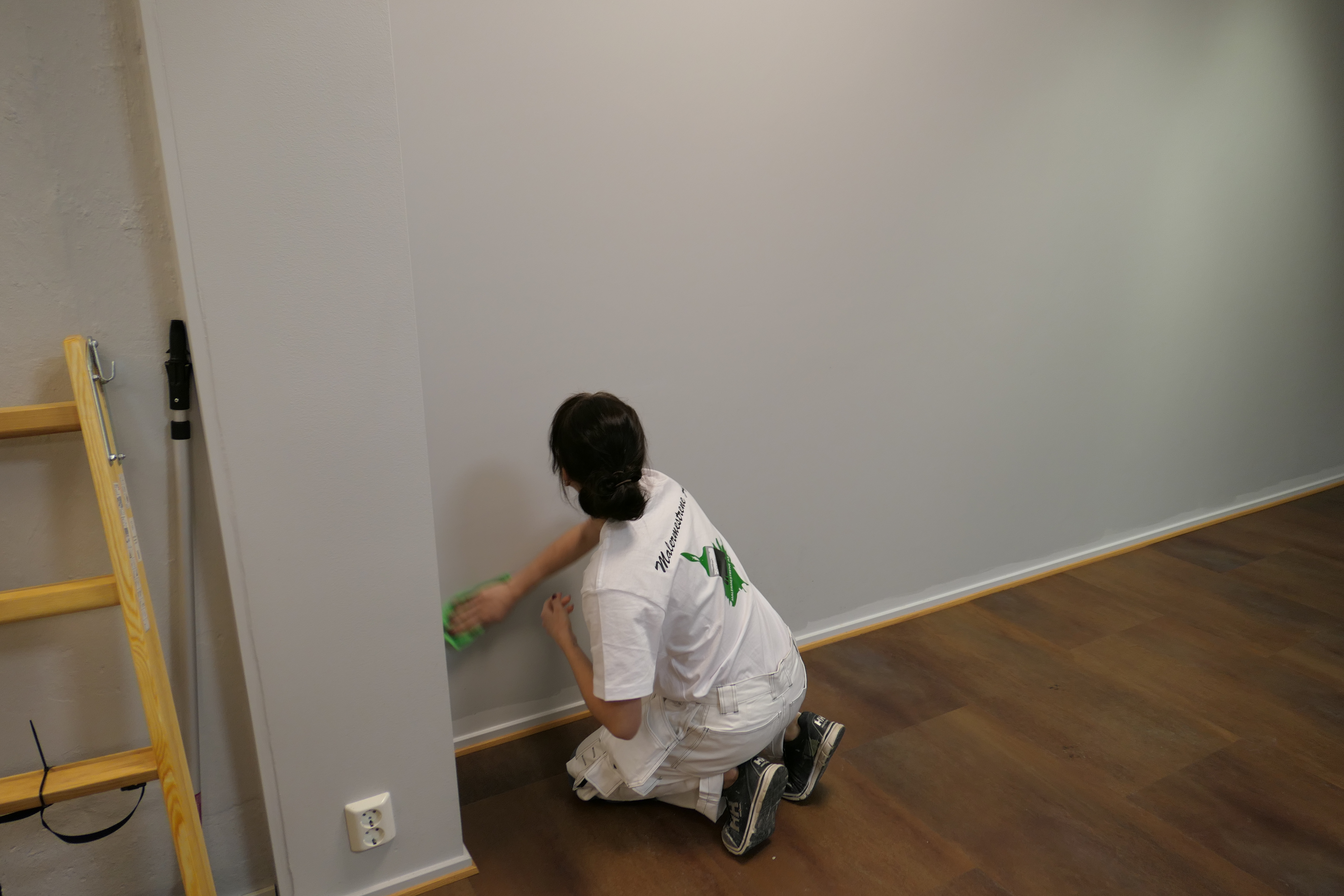 Tapetlim er litt tjukkere og seigere enn maling. Det skal verken kladdes på, eller smøres altfor gjerrig utover. Ewelina Sekiw påfører limet med vante hender. I hjørnene bruker hun pensel og liten rull, på flatene stor rull. Hun påfører limet i én og én lengde.