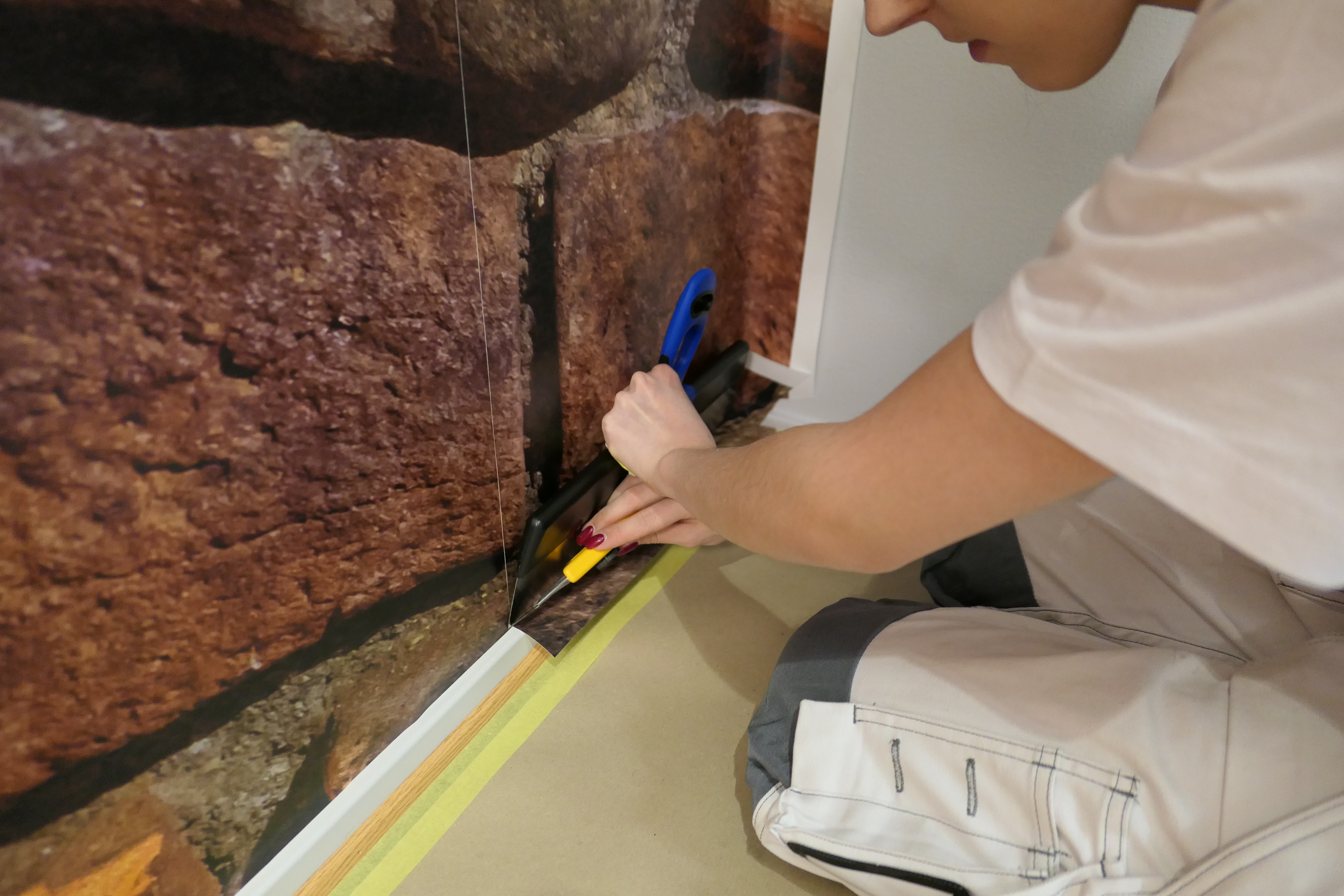 Deretter skjærer hun nøyaktig av tapetet, først oppe og så nede med en skarp tapetkniv, før hun går i gang med å påføre lim til neste lengde. Det limet som ligger utenfor det påsatte panelet er fortsatt vått. På grunn av denne måten å lime og legge panelene bortover på, bør helst hele jobben gjøres i én økt.