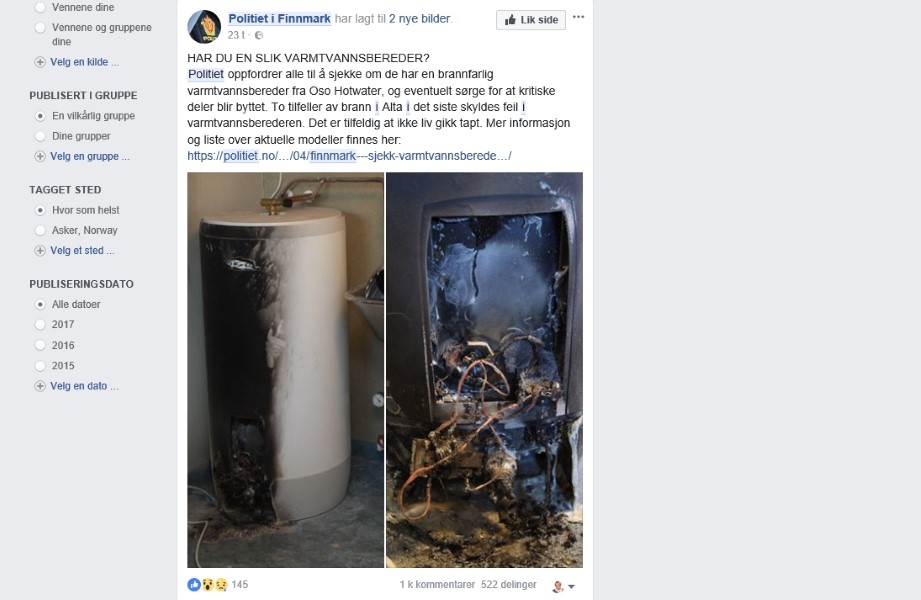 Politiet i Finnmark publiserte onsdag en advarsel på Facebook hvor de oppfordrer folk til å sjekke varmtvannstankene sine etter brann i to boliger. I meldingen sier politiet at det er tilfeldig at liv ikke har gått tapt.