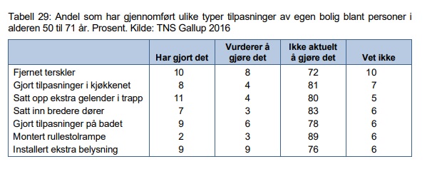 Få norske boliger er tilpasset en aldrende befolkning. SSBs befolkningsfremskrivninger viser at vi vil leve stadig lengre og dermed vil samfunnet være avhengig av at flere eldre blir boende hjemme lengre også. Kanskje er du blant de mange som ikke ser nytten av å tilpasse boligen din? I en rapport utført av Velferdsforskningsinstituttet NOVA i 2016, fremgår det at svært få seniorer mellom 50 til 71 år i det hele tatt vurderer å gjøre tiltak for å gjøre boligen tryggere. Kan det ha en sammenheng med at man ikke ser nødvendigheten før det er litt for sent? Eller kanskje er det stolthet?
