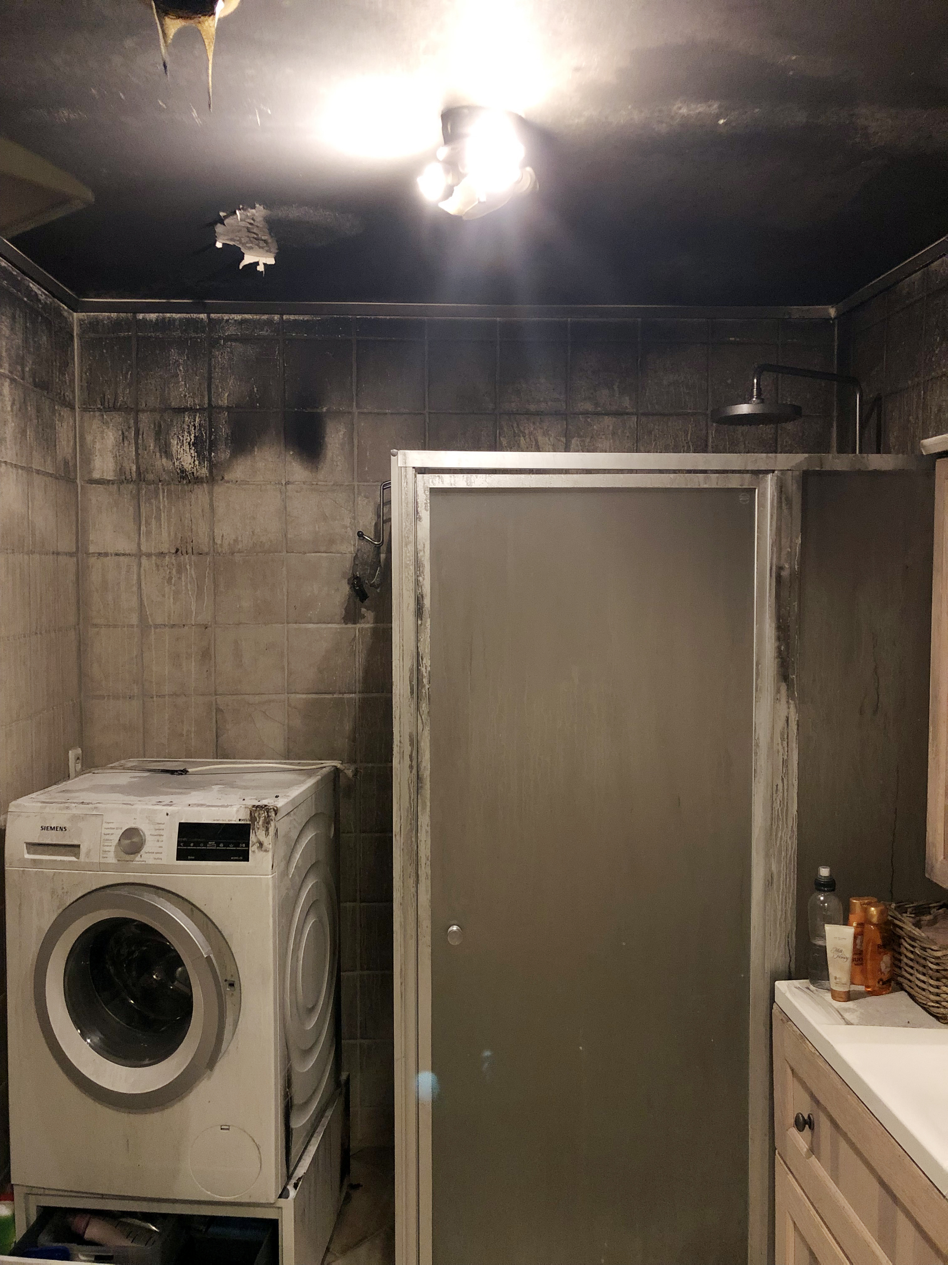 En vaskemaskin har tatt fyr på et bad. Foto: Frende