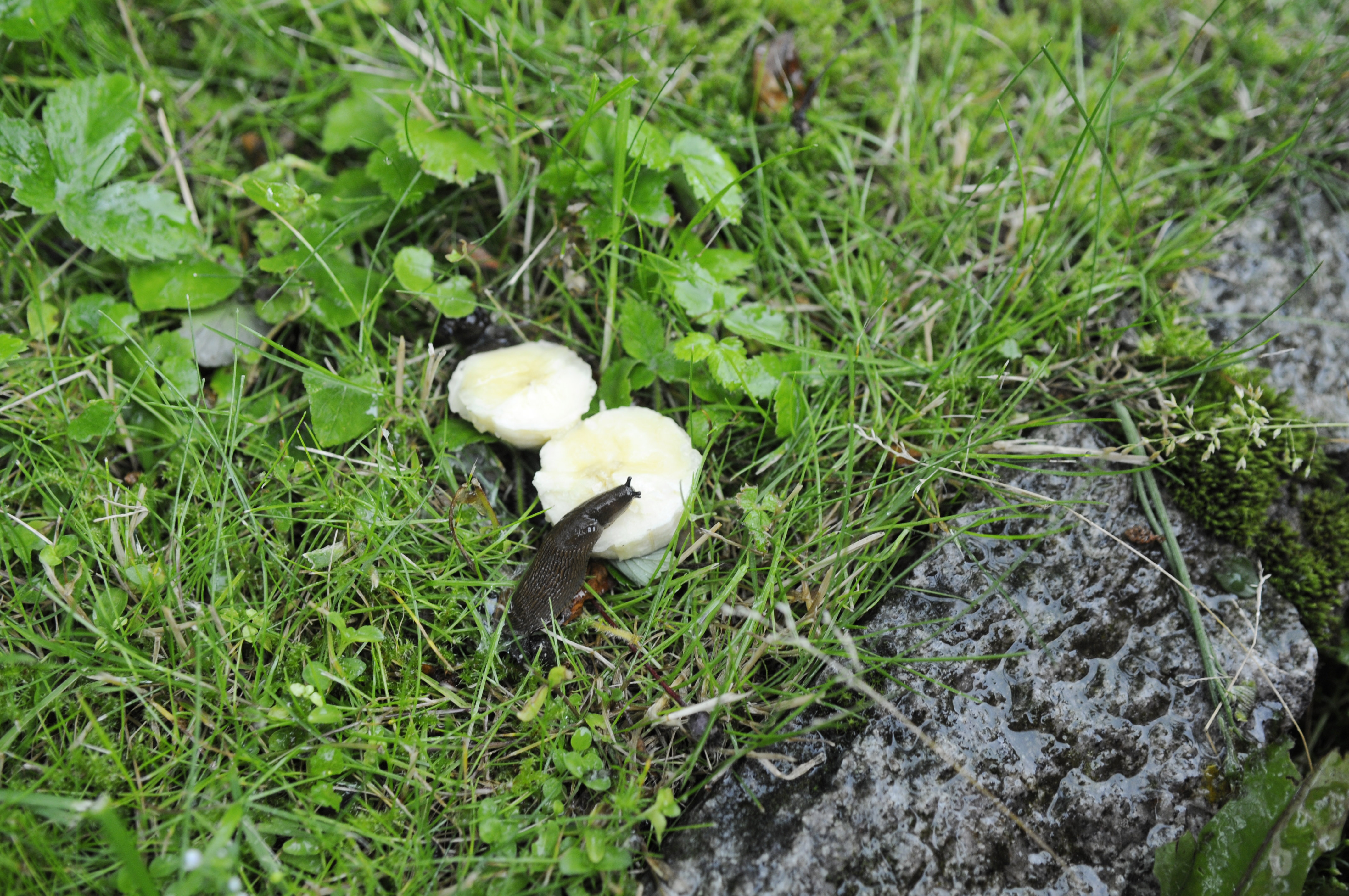 5) Dypp også biter av banan i blandingen og legg sammen med sneglerestene. Bananlukten tiltrekker seg snegler. Tøm det som eventuelt er igjen i bøtta over åtene til slutt.