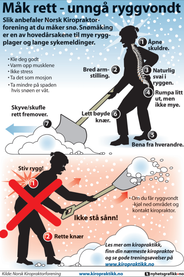 - Rent teknisk er kombinasjonen med rotasjon og fremoverbøy en bevegelse ryggen tåler dårlig. Når en slik kombinasjon skaper problemer bør man prøve å luke ut en av disse faktorene, og da er det lettest å sikre strak rygg. Deretter kan man heller rotere litt i det man lemper snøen bort, sier han.