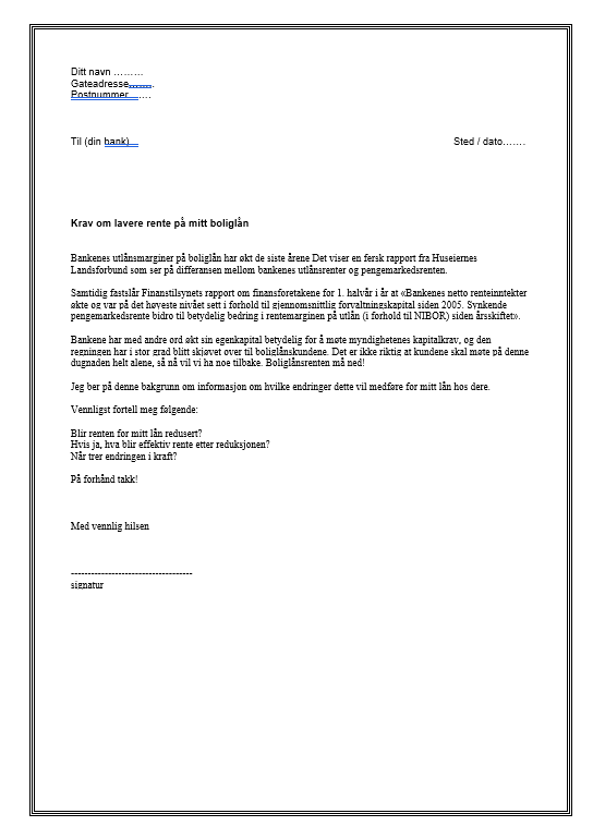 Det er viktig at du som kunde legger press på banken din. Så vi anbefaler deg å kreve lavere rente, og bytte bank hvis du ikke blir hørt. Det er det eneste språket bankene skjønner, og det er en fin måte for deg som kunde å bruke forbrukermakten din på. HL har derfor laget et standardbrev som du kan sende til banken din, så det blir enklere for deg å nå frem.