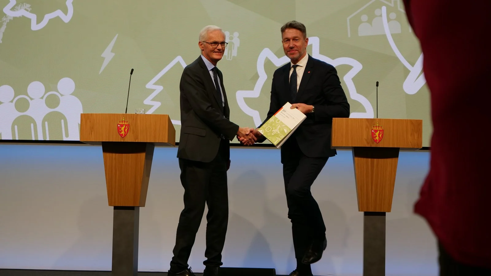 Leder av Energikommisjonen, Lars Sørgard, leverte onsdag 1. februar Energikommisjonens rapport til olje- og energiminister Terje Aasland. Rapporten ineholder viktige konklusjoner som vi håper regjeringen følge ropp. Foto: Jo Henrik Jarstø / OED.