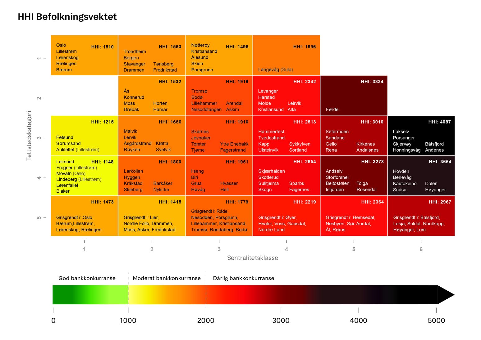 Huseierne har undersøkt bankkonkurransen på de ulike stedene i Norge. Figuren over viser at bankkonkurransen ikke er god på noen steder, og at den er faretruende dårlig på mange steder.