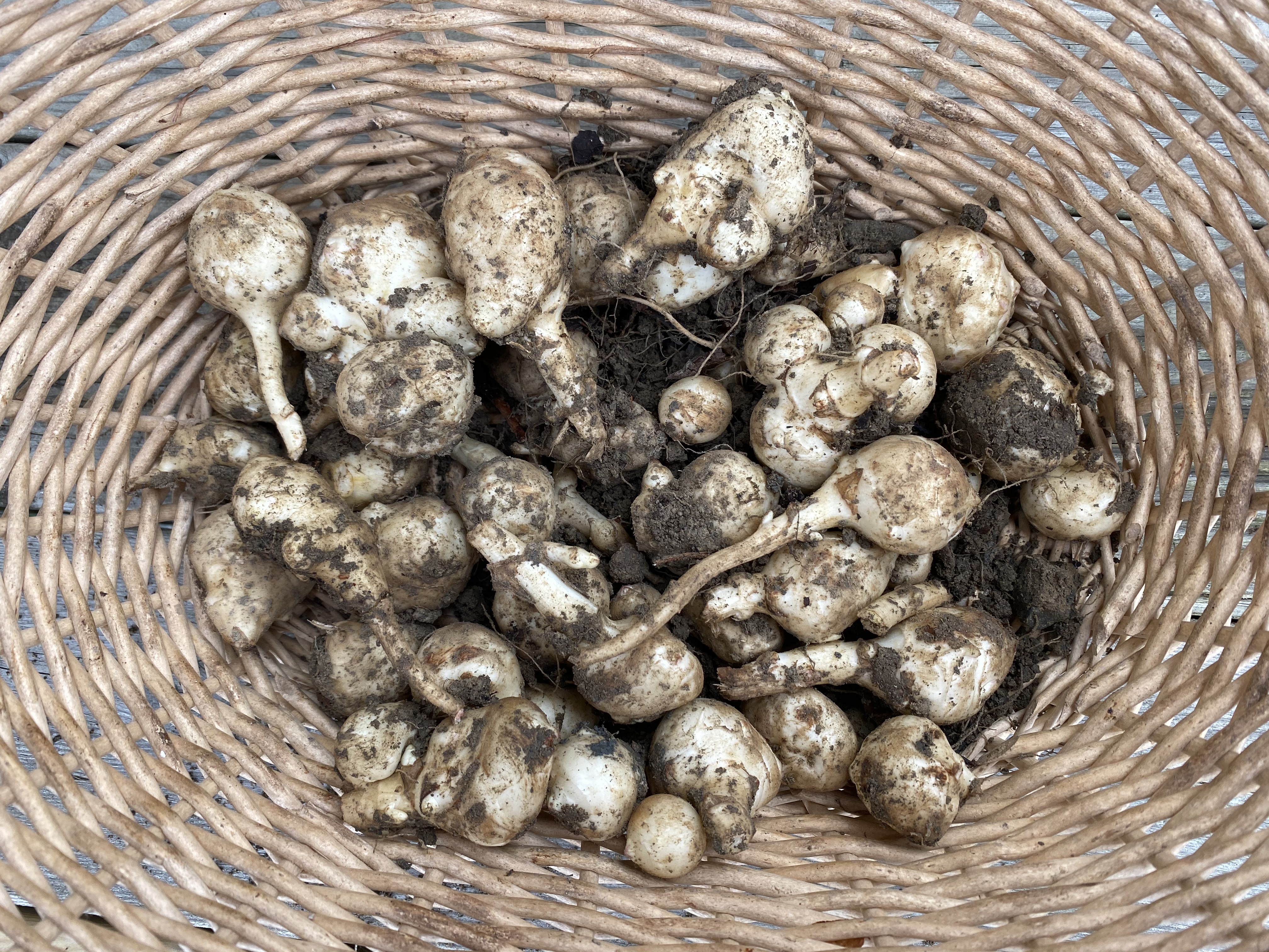 Et tredvetalls nye knoller etter en knoll som ble satt ned i mai. Noe blir suppe, noe blir plantet ut igjen.